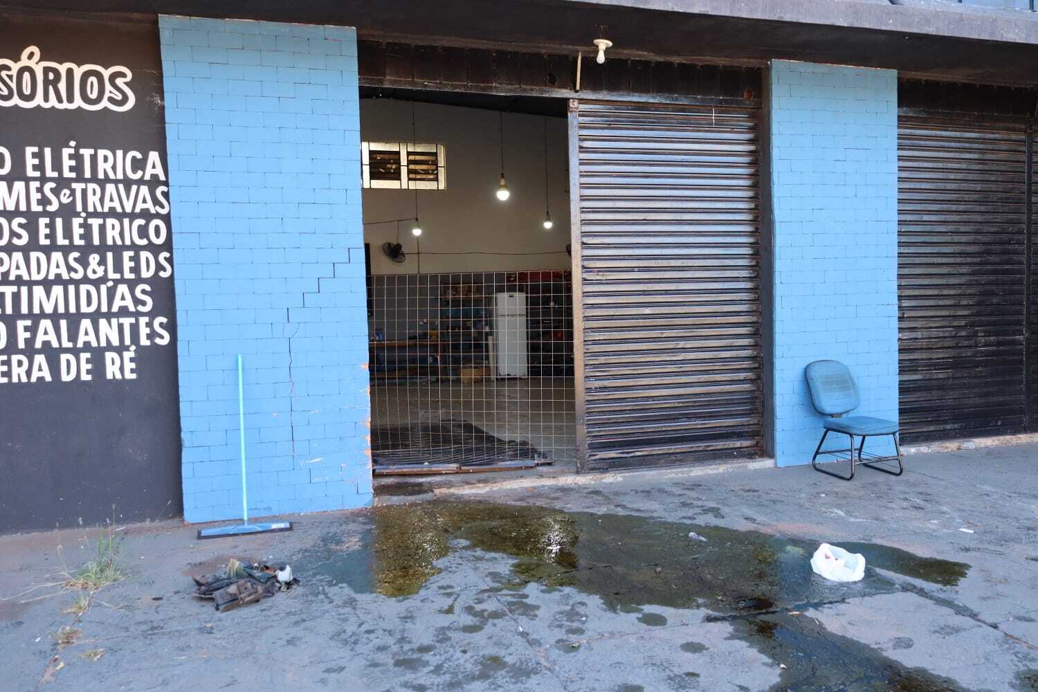 Na calçada da oficina há manchas de sangue, pedaços do veículo e manchas de óleo que podem ser de outros carros.