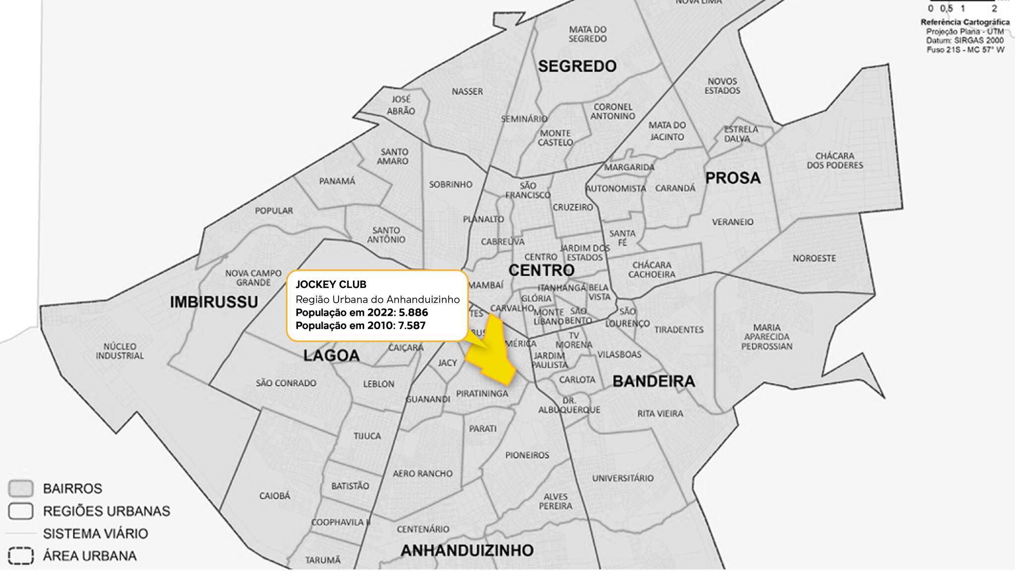 O Jockey Club fica localizada na região urbana do Anhanduizinho, que reúne grandes bairros, como Aero Rancho, Parati, Piratininga, Pioneiros, Alves Pereira e Centenário. Os números do Perfil Socioeconômico de Campo Grande, elaborados com dados dos Censos 2010 e 2022, mostram que o Jockey Club “encolheu”. Em 2010, a população era de 7.587 pessoas. Doze anos depois, o bairro aparece com 5.886 habitantes.