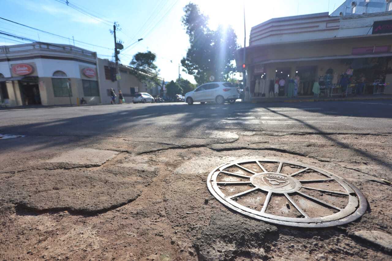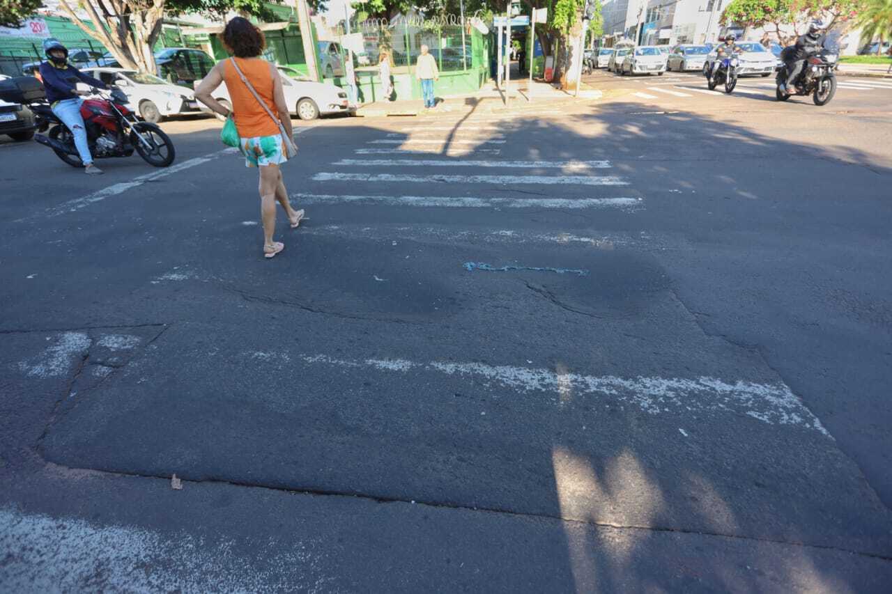 A esquina da Avenida Calógeras com a Rua 15 de Novembro, no Centro de Campo Grande, virou motivo de queixa por causa do estado do asfalto. No trecho da via há desnivelamento, recortes e muita ondulação bem ao lado da faixa de pedestres.