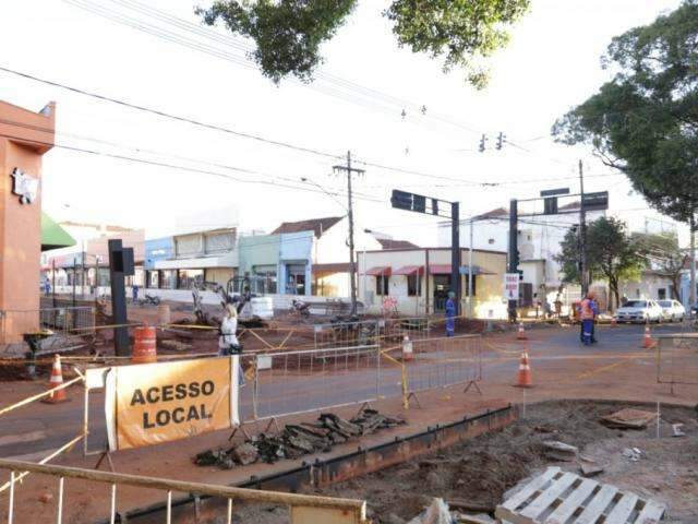 Uma das estacas de proteção, que isola a calçada no cruzamento da Rua 14 de Julho com a Avenida Afonso Pena, em Campo Grande, amanheceu n...