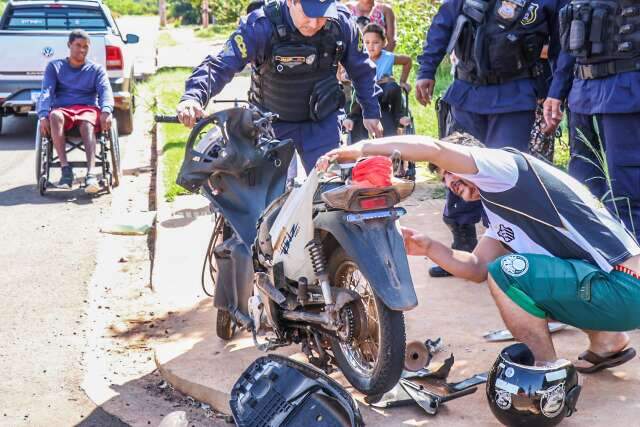 Acidente no cruzamento das avenidas Joaquim Murtinho com Fernando Corrêa da Costa deixou motociclista deitado no asfalto quente e à esper...