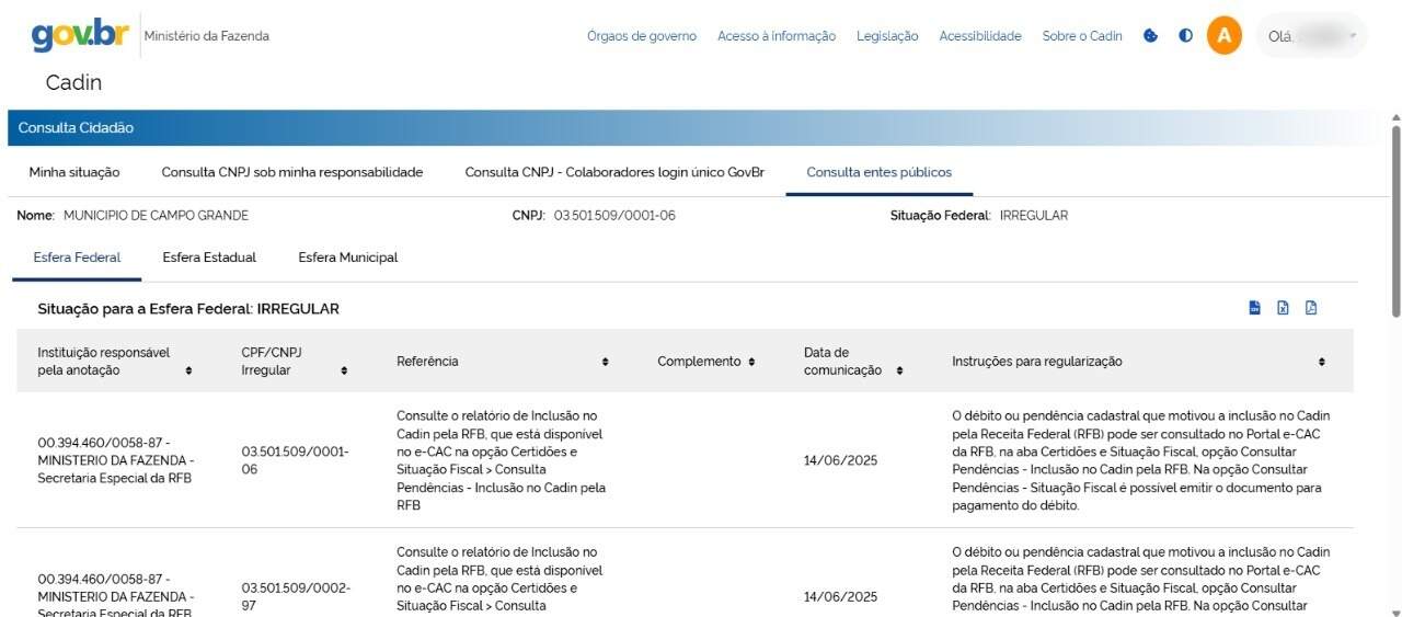 A reportagem verificou que a Certidão de Situação Fiscal na Receita expirou no último dia 7. Porém, no Cadin (Cadastro Informativo de Créditos não Quitados do Setor Público Federal), a situação da Prefeitura de Campo Grande está irregular desde 14 de junho. O Cadin é banco de dados no qual estão registrados os nomes de pessoas físicas e jurídicas em débito para com órgãos e entidades federais.