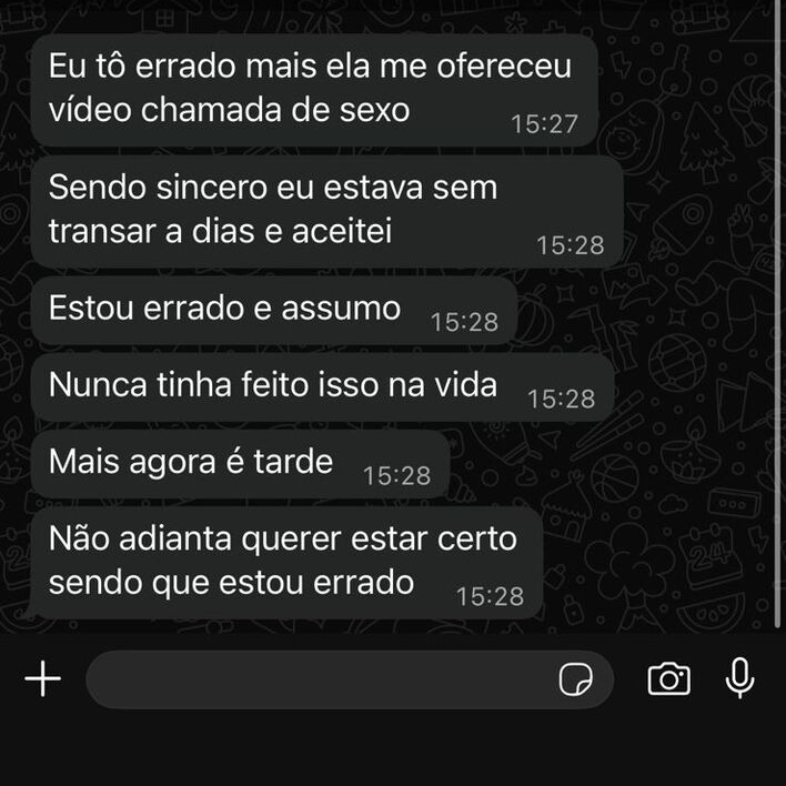 "Descobri que ele registrou um boletim de ocorrência, mas não houve extorsão. Foi para tentar invalidar o meu depoimento. Ele quer que o delegado pense que eu 'inventei' ou 'armei' a situação para ganhar dinheiro, o que é mentira, já que eu tem os registros de que buscava um emprego honesto", finaliza. Nas conversas, ele se justifica, dizendo que a mulher ofereceu vídeo por sexo.