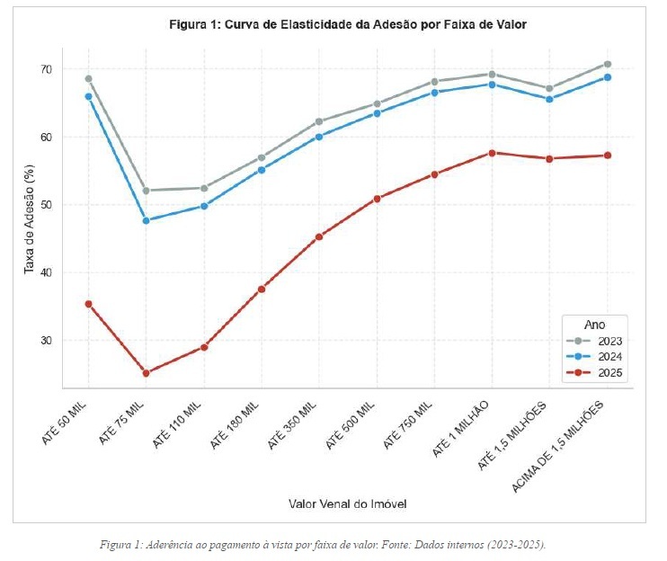 Outros documentos anexos indicam ainda que ano a ano - entre 2023 e 2025 - a adesão ao pagamento imediato, mesmo com desconto de 20%, diminuiu. "A manutenção de um percentual de desconto elevado provou-se ineficaz para frear a inadimplência ou estimular a cota única nas faixas de menor valor venal".