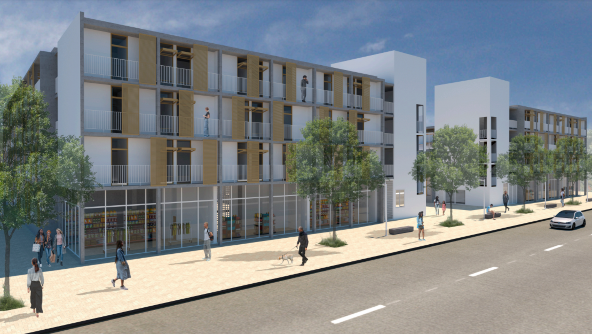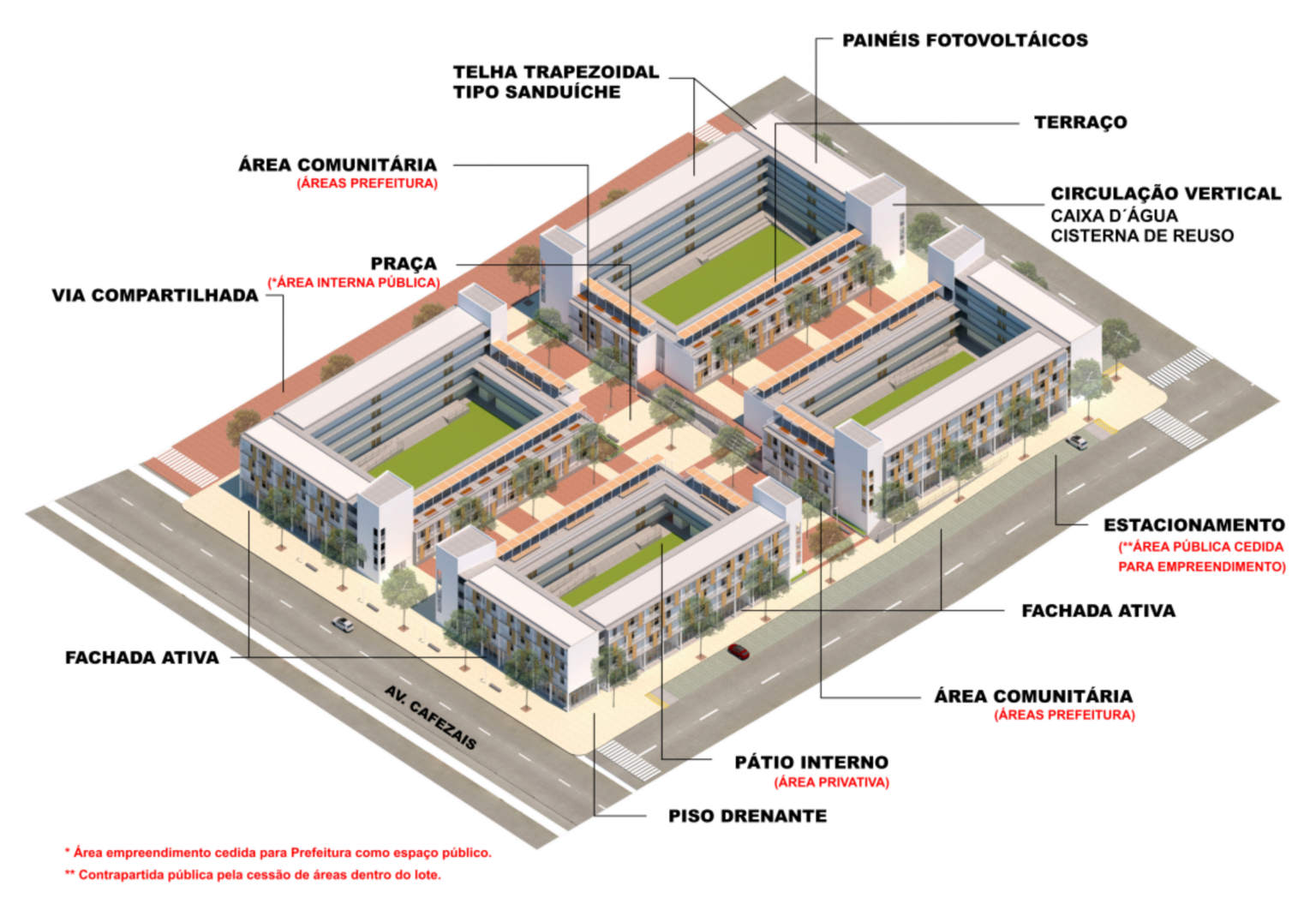 De acordo com a Emha, o projeto prevê um modelo urbanístico aberto, sem muros e sem áreas de exclusão, às margens da Avenida dos Cafezais. Serão quatro blocos residenciais com espaços comerciais integrados, totalizando 15 lojas.