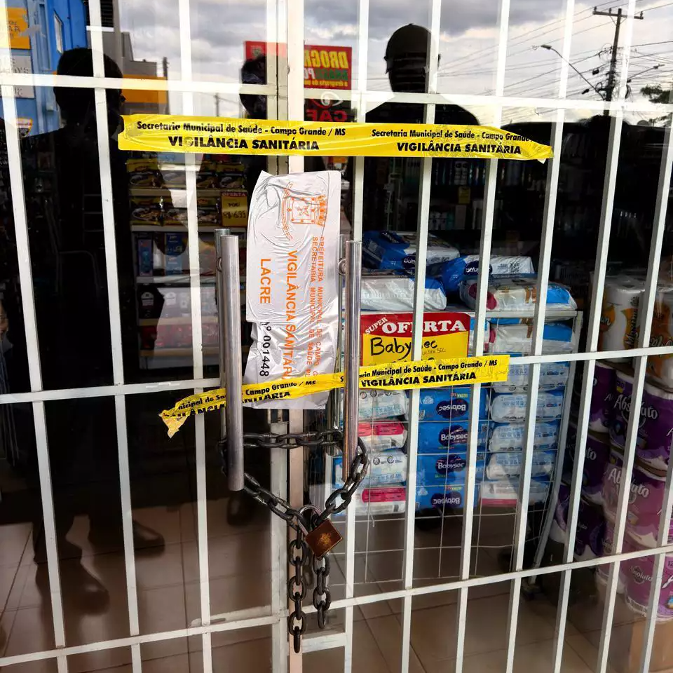 Farmácia interditada pela Vigilância Sanitária em Campo Grande (Foto: Bruna Marques)