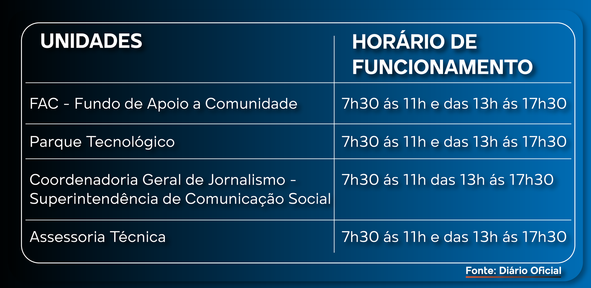 Entre as unidades incluídas na exceção estão o Fundo de Apoio à Comunidade, o Parque Tecnológico, a Coordenadoria-Geral de Jornalismo da Superintendência de Comunicação Social e a Assessoria Técnica, todas com expediente das 7h30 às 11h e das 13h às 17h30.