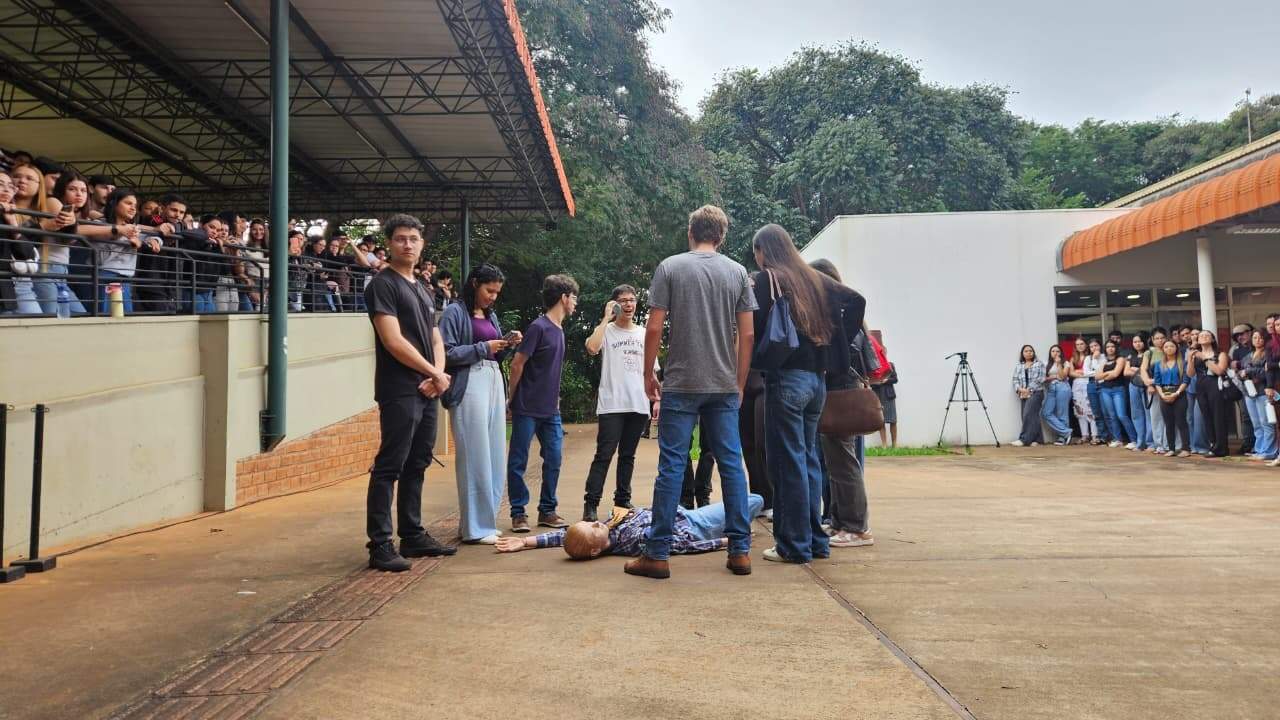 A Universidade Católica Dom Bosco (UCDB), em Campo Grande, realizou nesta quinta-feira (30) uma simulação de homicídio no campus, reunindo cerca de 1.500 alunos do curso de Direito, policiais militares e civis. A atividade reproduziu todas as etapas de um crime real, da cena do delito à audiência de custódia, com estudantes atuando como testemunhas e suspeitos, visando aproximar a teoria jurídica da prática profissional.