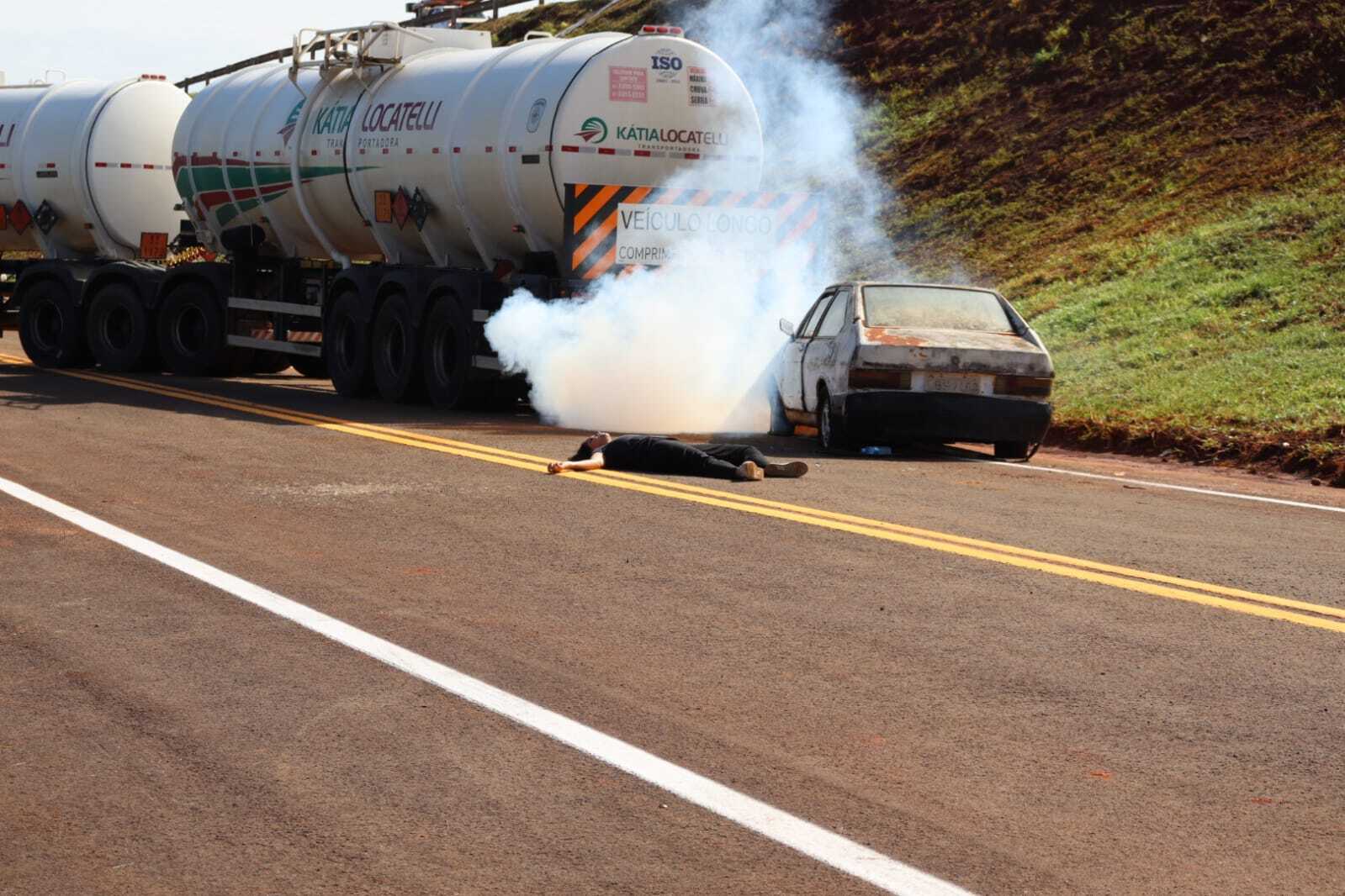 Simulado de acidente com produtos perigosos mobilizou mais de 100 profissionais na BR-163, em Campo Grande, nesta quinta-feira (16). A ação da concessionária Motiva Pantanal envolveu cinco veículos, 20 vítimas e resgate aéreo com helicóptero da FAB. Os cenários incluíram colisões, ônibus tombado e vazamento de etanol. Participaram Samu, Bombeiros, Polícia Militar, Detran-MS e outros órgãos.