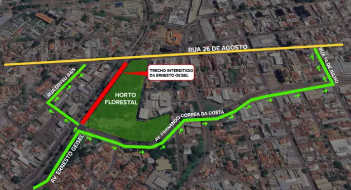 A Avenida Presidente Ernesto Geisel, em Campo Grande, foi interditada na manhã desta sexta-feira para a remoção de 12 árvores no Horto Florestal. O bloqueio, entre a Avenida Fernando Corrêa da Costa e a Rua 26 de Agosto, tem previsão de término às 16h. A maioria das árvores removidas são eucaliptos considerados de alto risco de queda, conforme avaliação da Semades. Após a remoção, novas espécies serão plantadas em parceria com a Universidade Federal, criando um jardim do Cerrado. O Horto Florestal será revitalizado e gerido pela Fecomércio.