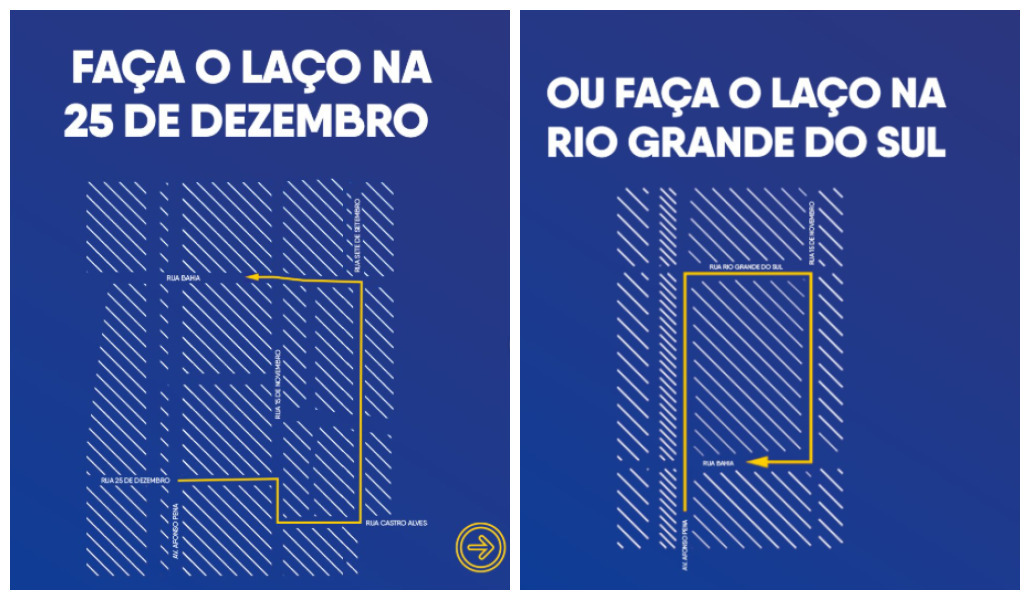 Condutores que estão na Rua 7 de Setembro no sentido Centro têm como opção acessar a Rua Bahia ou, uma quadra antes, a Rua Rio Grande do Sul, para chegar à Avenida Ricardo Brandão.