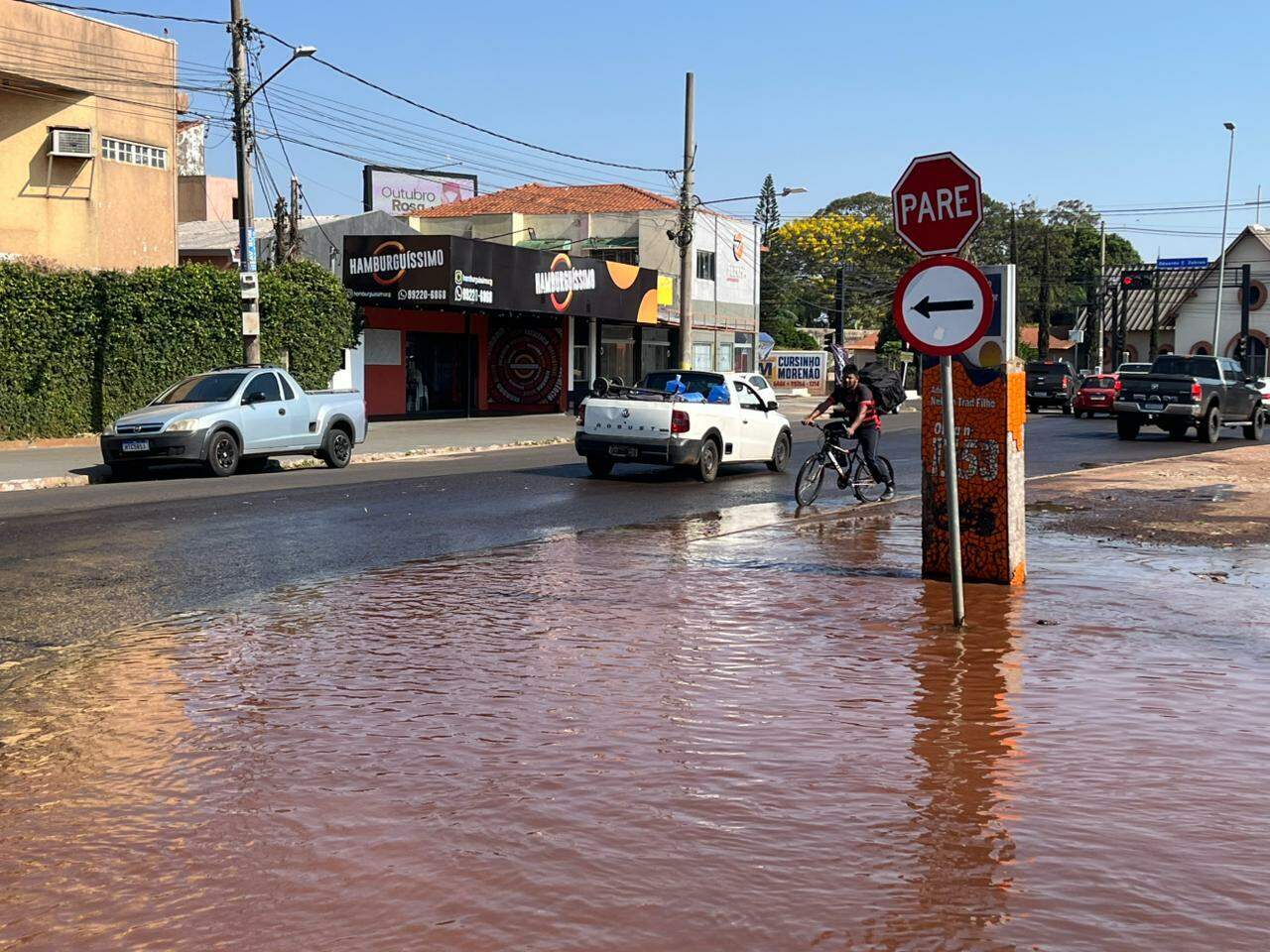 Enquanto a reportagem estava no local, um entregador de bicicleta precisou manobrar cuidadosamente para não cair na água acumulada. Motoristas que passavam pelo cruzamento também reduziam a velocidade para evitar danos aos veículos.