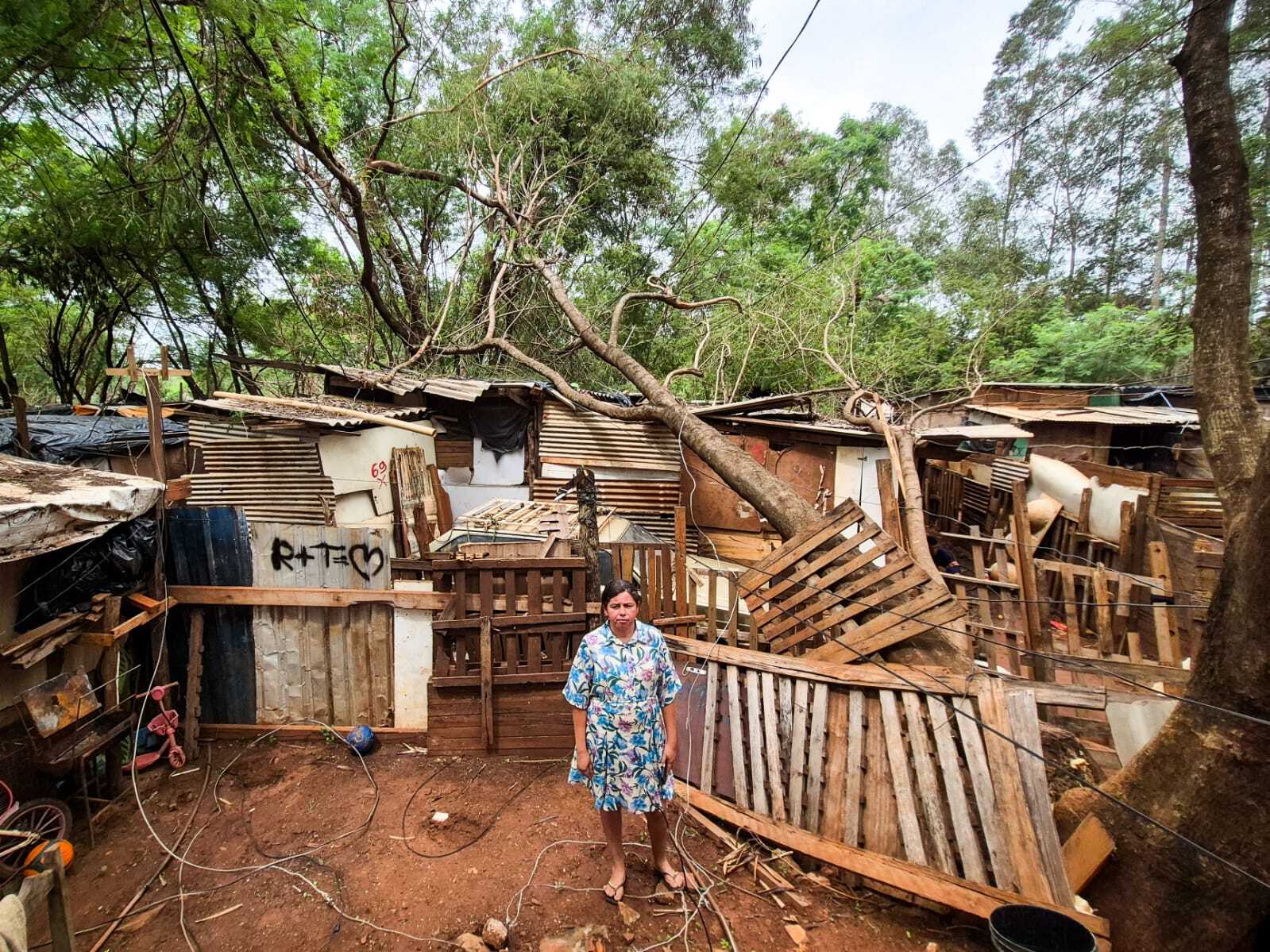 Quando saiu de casa, descobriu a extensão do dano. A ventania repentina derrubou uma árvore sobre o barraco de quatro cômodos e outras duas no entorno. Ela, o marido e os quatro filhos (13, 9, 5 e 1 ano) escaparam ilesos. Assustados com o barulho, os vizinhos também saíram para ver o que aconteceu.