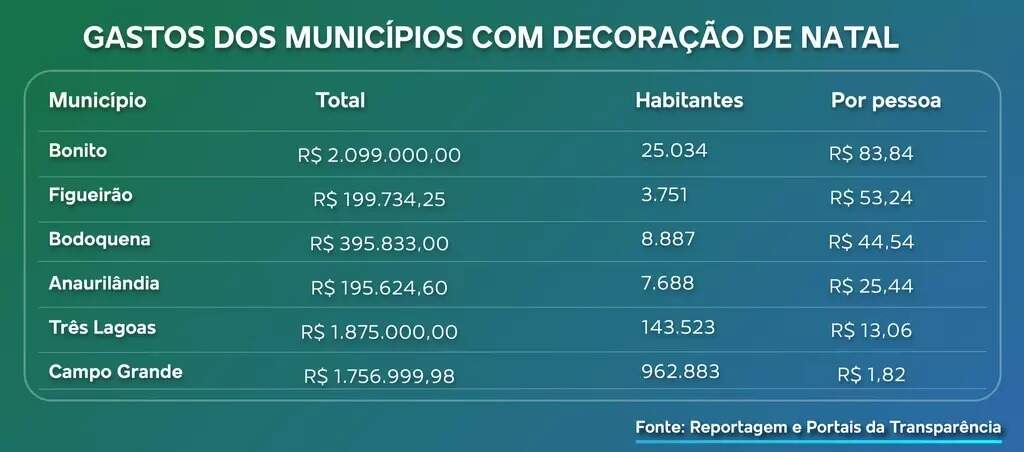 O levantamento feito pelo Campo Grande News no início de novembro deste ano mostra que as prefeituras do interior gastam até 46 vezes mais com decorações de Natal do que Campo Grande, cidade com o maior número de habitantes de Mato Grosso do Sul. Para este ano, Bonito é o município com maior gasto natalino, com orçamento de R$ 2 milhões.