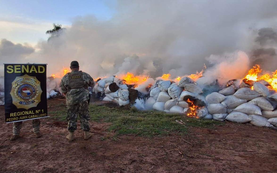 Paraguai desmantela base de tráfico com quase 19 toneladas de maconha na fronteira com MS. A Senad encontrou a droga, veículos e um rifle em Cristino Potrero, próximo a Capitán Bado. A região, sob influência do Comando Vermelho, servia como centro logístico para processar e armazenar a droga antes do envio ao Brasil. A operação resultou na apreensão de duas caminhonetes, um carro, três motos e munições. Todo o material, incluindo equipamentos de processamento da droga, foi incinerado no local. Apesar da apreensão, não houve prisões. A maconha estava dividida em bolsas de 20 kg, pronta para distribuição.