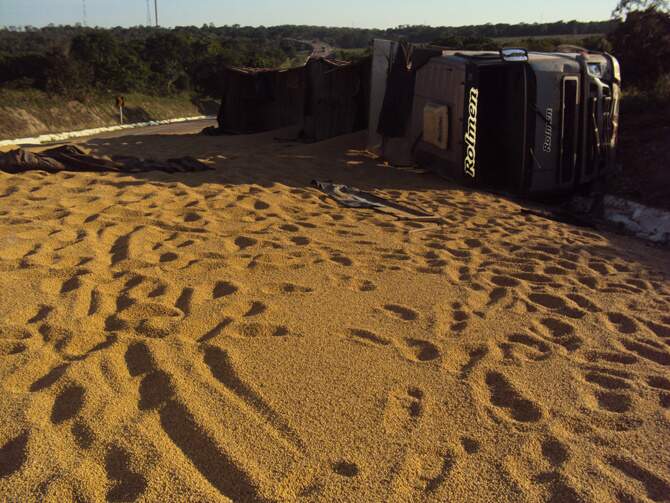Acidente na BR-163, entre Coxim e Rio Verde, esparramou 38 toneladas do grão e causou cortes na cabeça do caminhoneiro