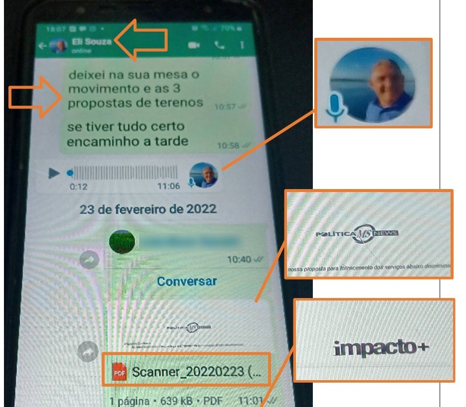 Mensagem enviada ao WhatsApp de Francisco Elivaldo de Souza, o Eli Souza, proprietário da empresa Impacto Jornalismo, informa que o interlocutor deixou na mesa “três propostas de Terenos”.