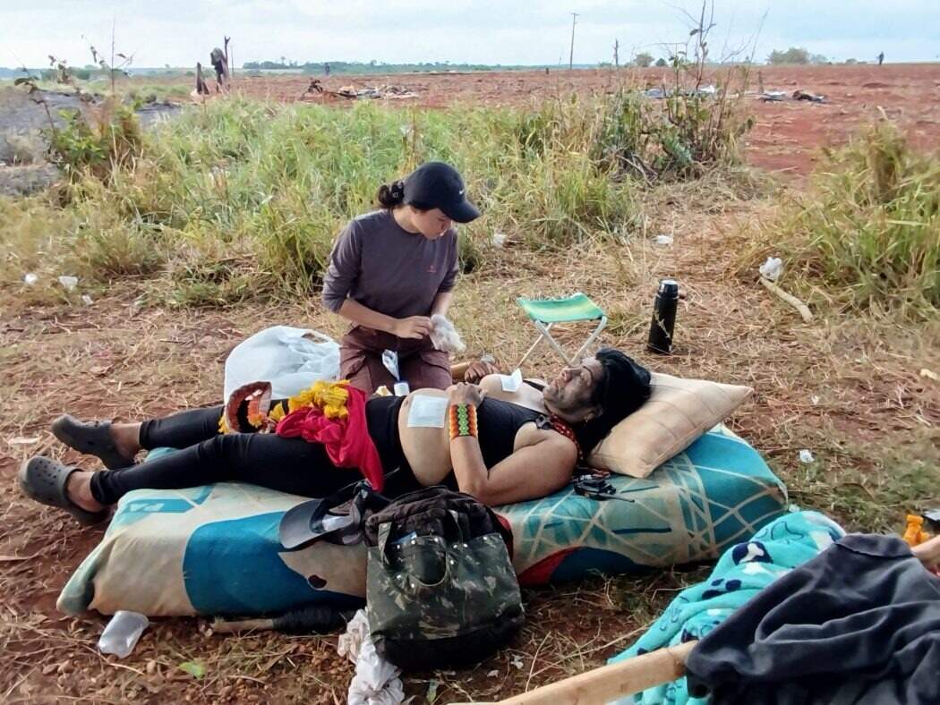 Feridos sendo atendidos em acampamento após conflito no dia 17. Ao fundo, barracos destruídos (Foto: Lídia Farias/Cimi/Divulgação)