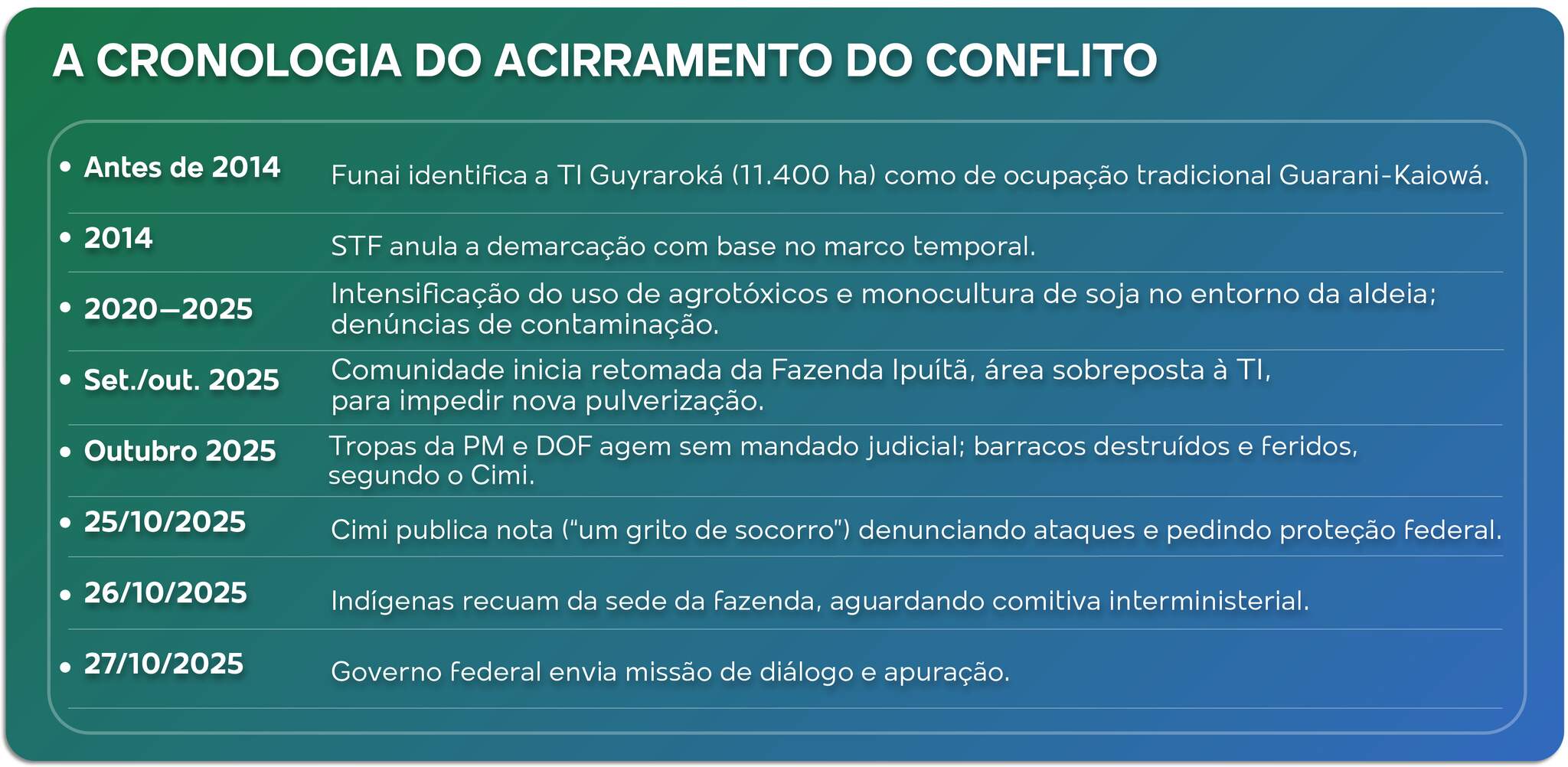 O conflito em Guyraroká, território indígena em Caarapó, Mato Grosso do Sul, intensificou-se após a decisão do STF em 2014 que anulou sua demarcação com base na tese do marco temporal. Os guarani e kaiowá, que reivindicam 11,4 mil hectares, permanecem confinados em apenas 50 hectares, gerando tensões com fazendeiros locais. A disputa envolve denúncias de violência de ambos os lados. Indígenas relatam ataques com agrotóxicos e agressões físicas, enquanto proprietários rurais acusam invasões e depredações. A área, reconhecida como território indígena pela Funai em 2001, está sob disputa judicial, com processos pendentes que incluem pedido de indenização de R$ 170 milhões por danos à comunidade.