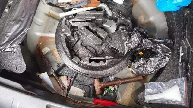 Martelo e faca utilizadas no crime no porta-malas do carro (Foto: Leandro Holsbach)