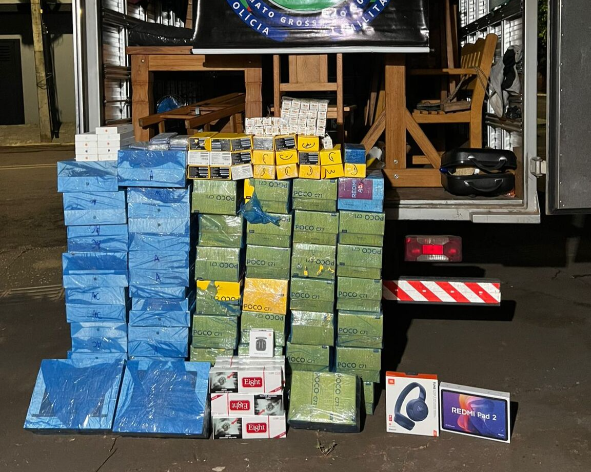 A Polícia Militar apreendeu mercadorias avaliadas em R$ 1,7 milhão durante fiscalização de rotina na MS-158, em Brasilândia. Três pessoas foram presas transportando 1.235 celulares importados, 37 MacBooks Pro e 28 caixas de canetas emagrecedoras em um fundo falso no baú de um caminhão. Os policiais descobriram o compartimento oculto ao perceberem inconsistências nas medidas do baú do veículo, que transportava móveis rústicos. Os suspeitos, com idades entre 28 e 40 anos, foram encaminhados à Polícia Federal por descaminho e contrabando.
