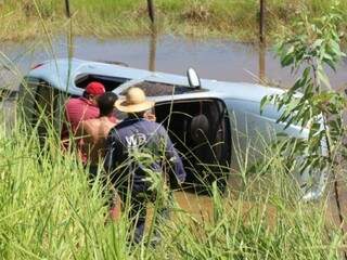 Três pessoas ficam feridas após carro capotar e cair em área alagada da MS-276