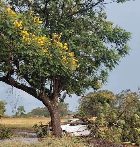 Carro atingido por galho de árvore derrubado pelo vento (Foto: Divulgação/Vale do Ivinhema Agora)