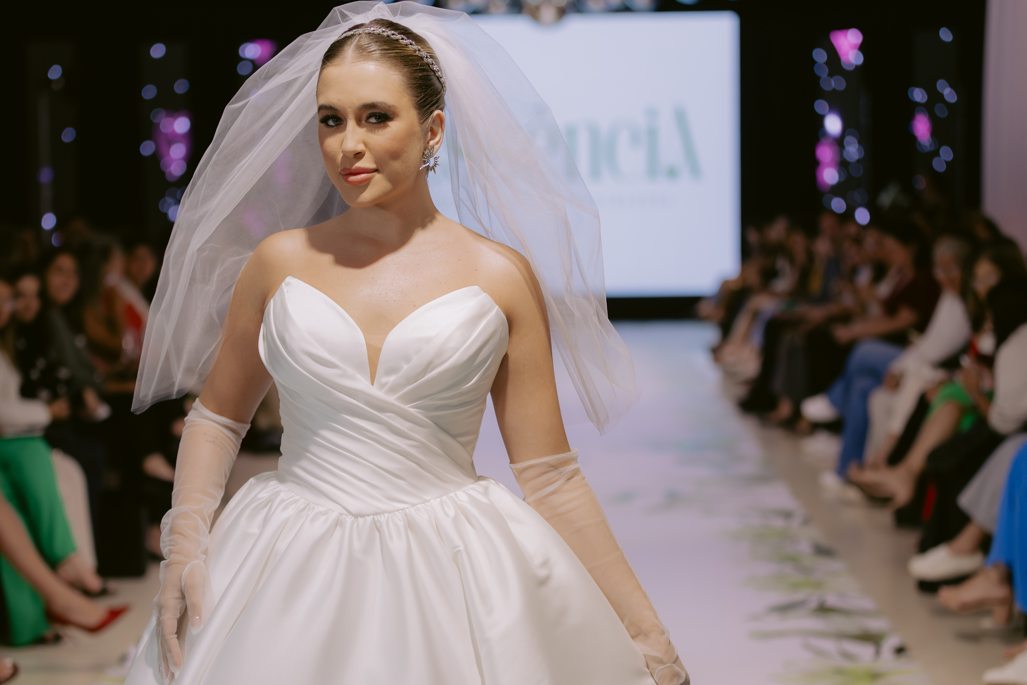 Entre os destaques da noite, dois vestidos chamaram a atenção do público. O modelo Fiora aposta no mikado, na silhueta sereia e no decote sem alças, com estrutura marcante e presença cênica. Já o Loiza segue a mesma linguagem, reforçando elegância e atemporalidade em uma construção limpa, sem excessos.