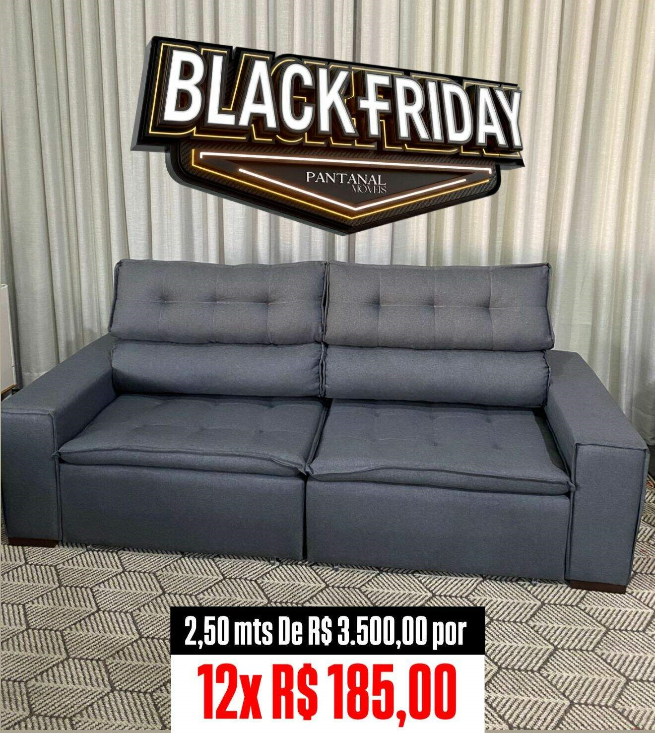 O destaque é o sofá retrátil e reclinável de 2,50 metros que cai de R$ 3.500 para 12 parcelas de R$ 185,00 no Cartão de Credito! A oferta tem clima de urgência, já que o estoque é de apenas 5 peças. Para quem não quer ficar refém da sorte, chegue cedo! A loja exibe ainda mais de 35 modelos de sofá na Black, com entrega mais rápida de Campo Grande e opções que começam em 12 parcelas de 99,00 reais, no cartão de crédito.