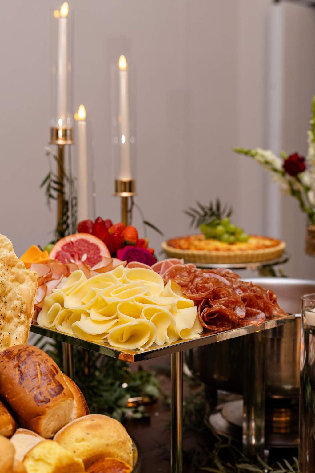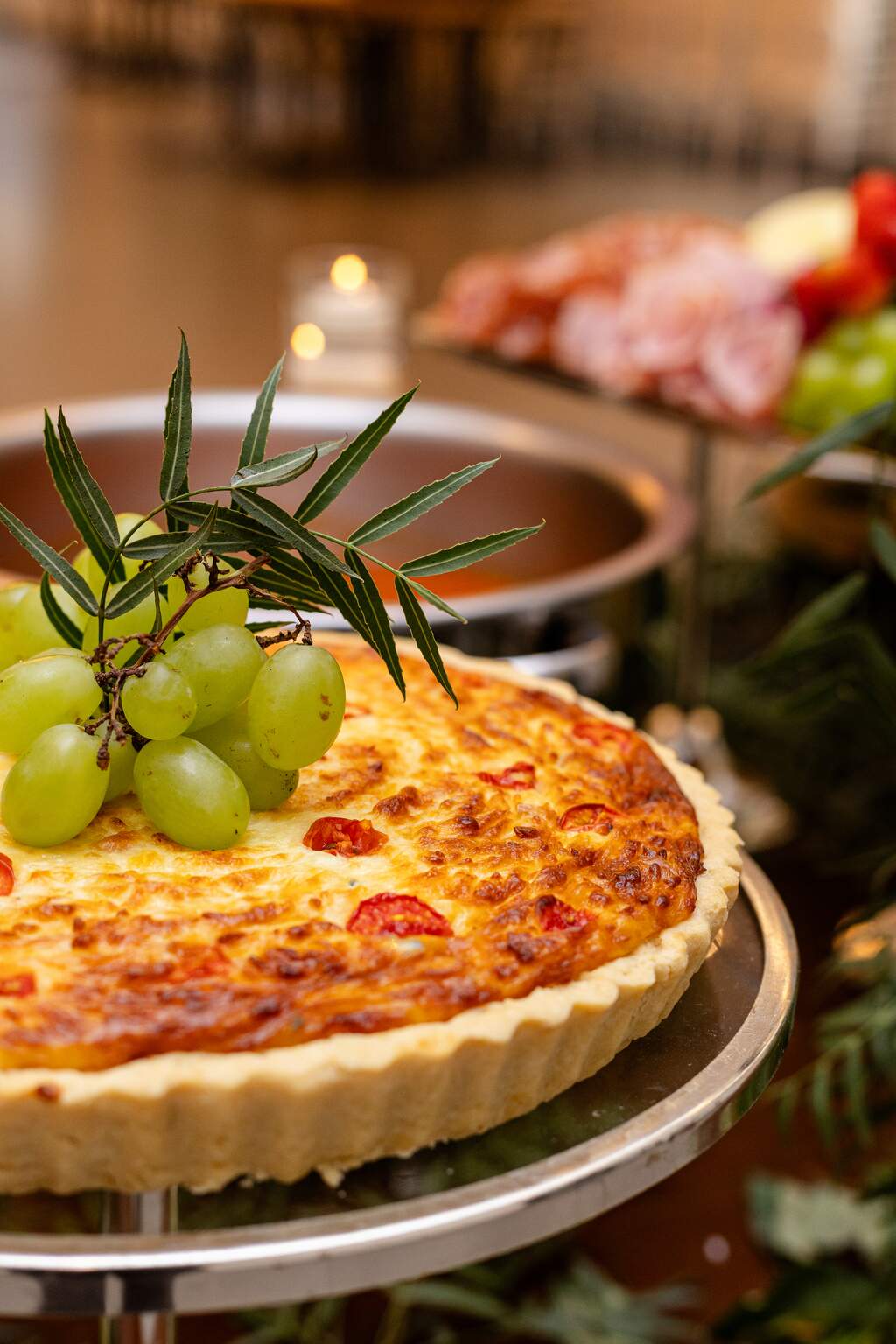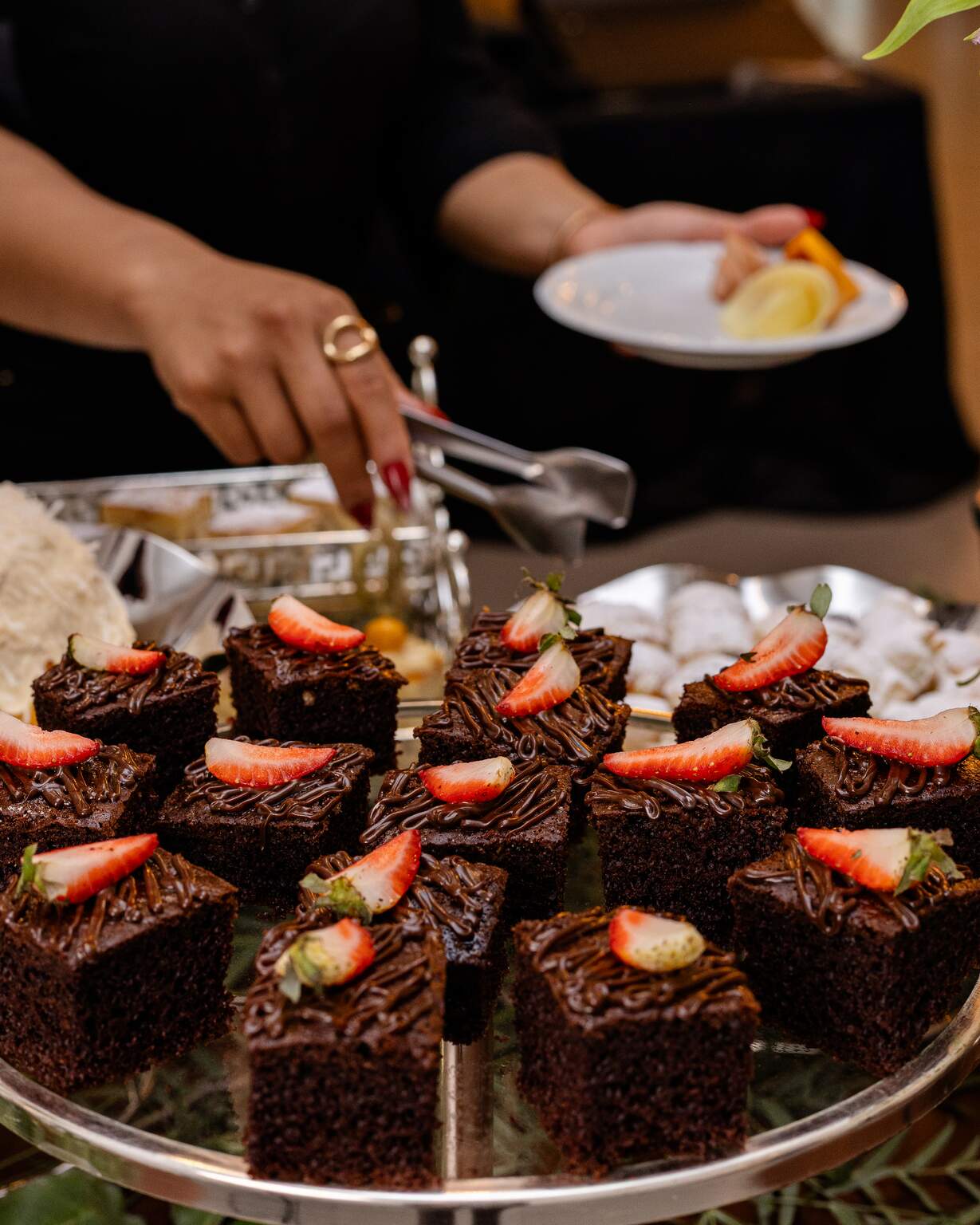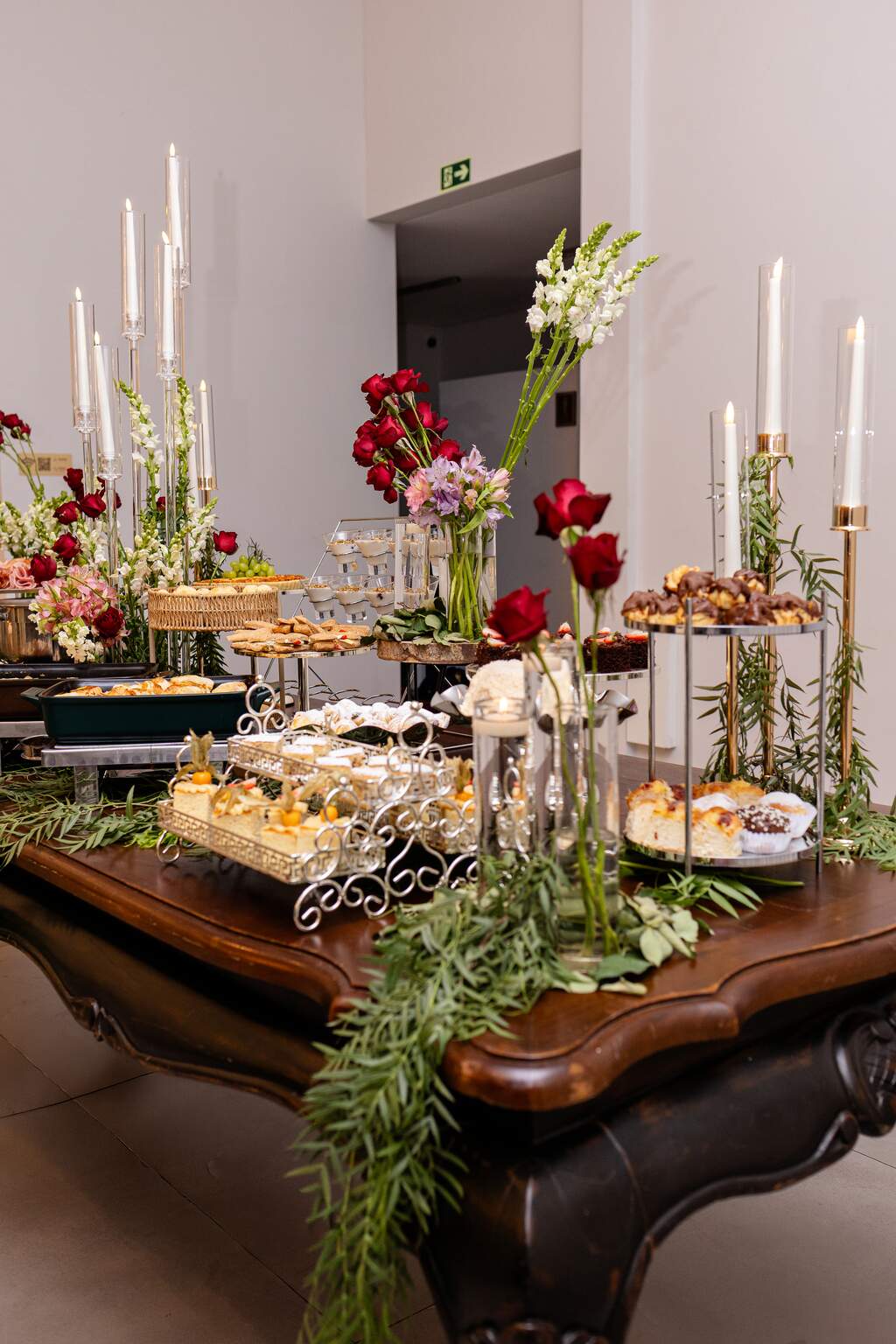 As opções quentes incluem ovos mexidos, mini salsichas ao molho, calabresa acebolada e banana da terra grelhada. Para quem prefere algo mais leve, há verrine de iogurte grego com geleia de frutas vermelhas e granola, além de frutas frescas como banana, maçã, melão, mamão e abacaxi.