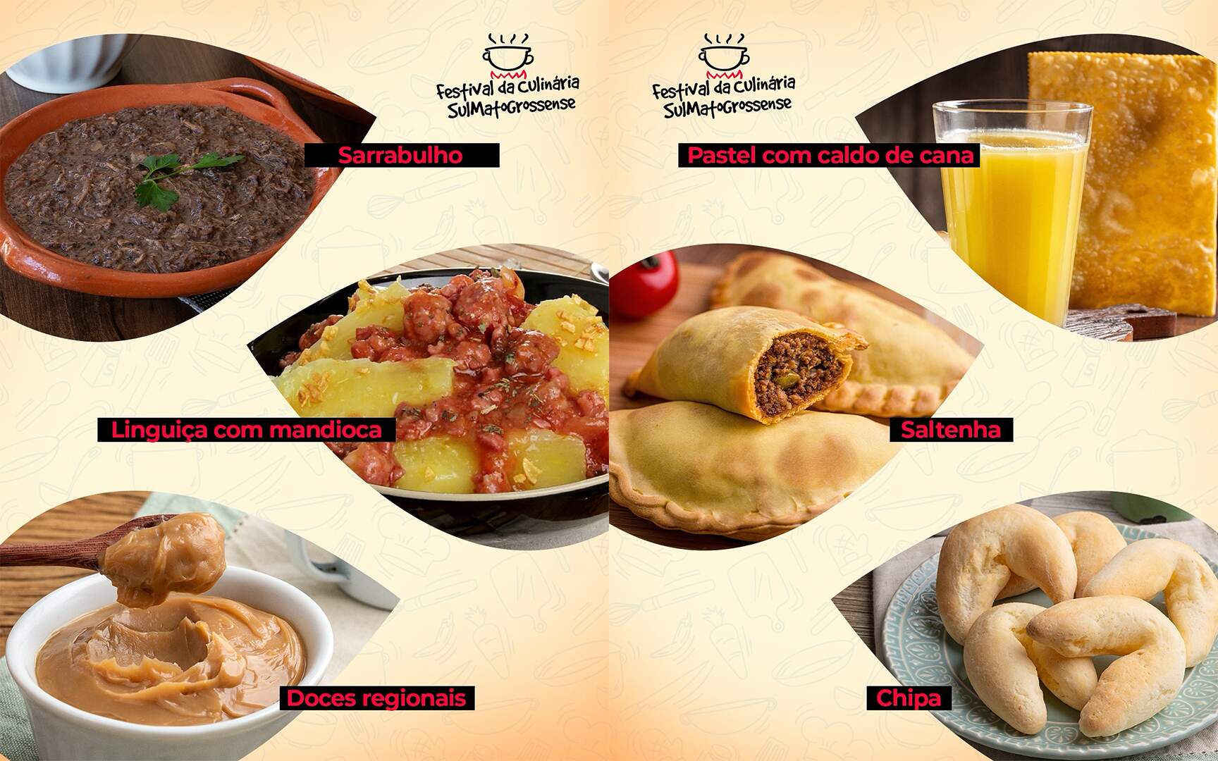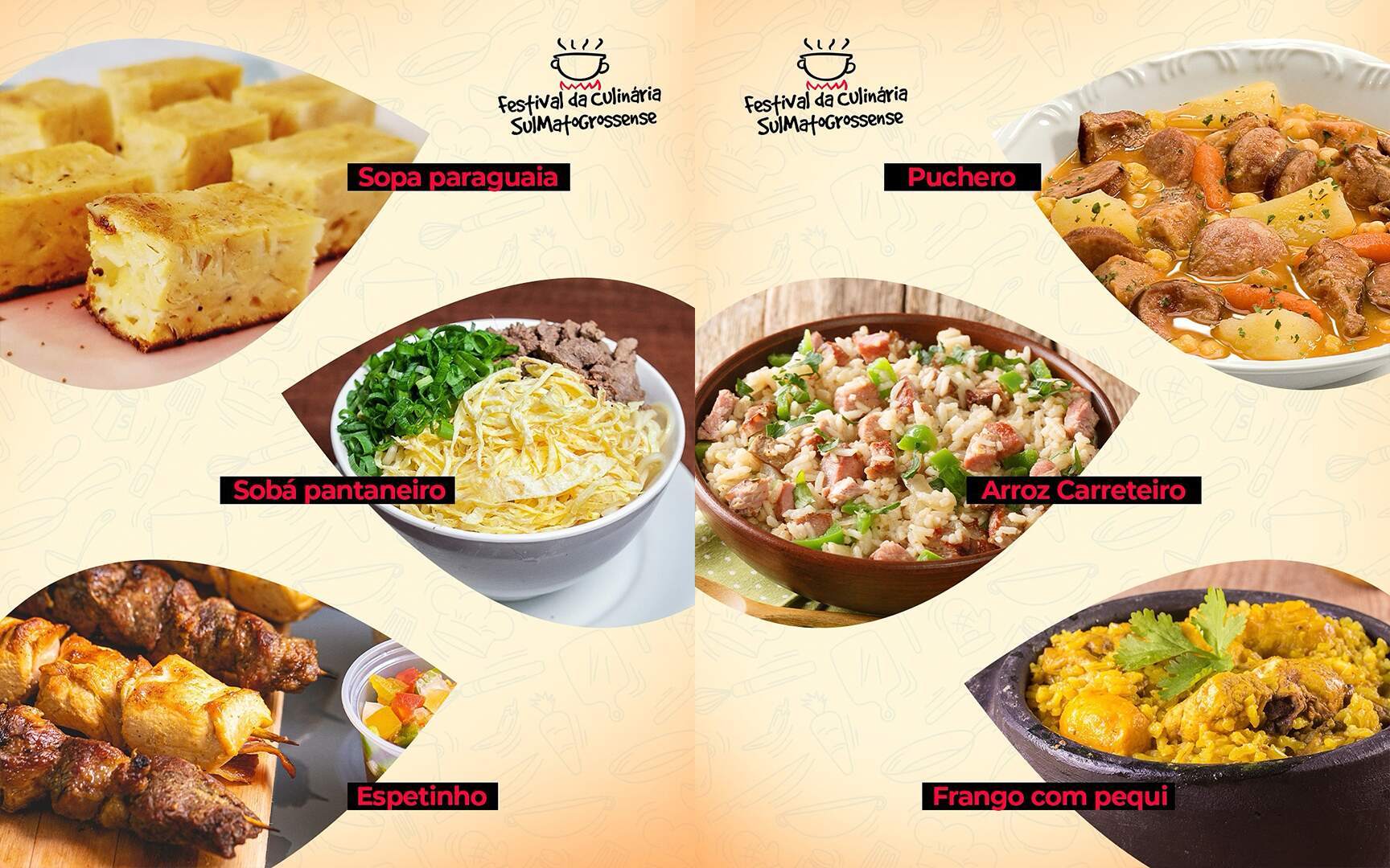 O festival reúne pratos que fazem parte da identidade cultural do Mato Grosso do Sul, oferecendo ao público a chance de saborear receitas que atravessam gerações. Entre as opções confirmadas estão o arroz carreteiro, o tradicional sobá pantaneiro, o frango com pequi, o puchero, a saltenha, o sarrabulho, além dos espetinhos e outras iguarias que já se tornaram marca registrada da culinária local.