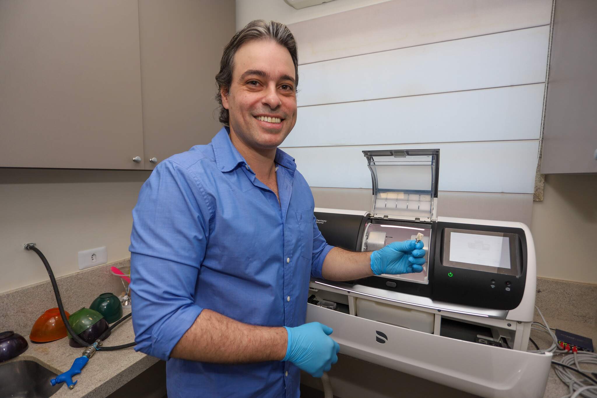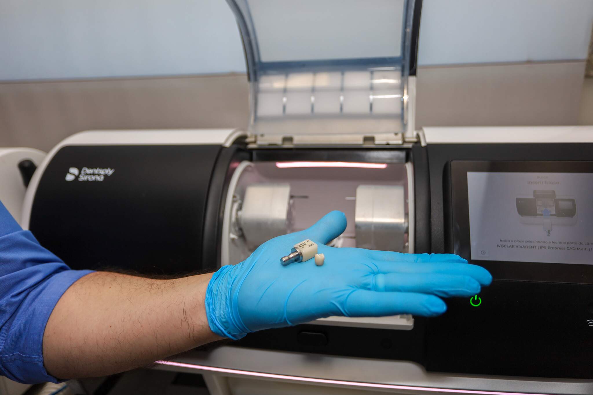 Antigamente a gente moldava, mandava para o laboratório, o paciente voltava dias depois e, às vezes, ainda precisava ajustar porque algo incomodava. Hoje, eu escaneio a boca, desenho o dente no computador e o sistema já envia o projeto para a fresadora, que esculpe o bloco de porcelana na hora”, explica Alberto.