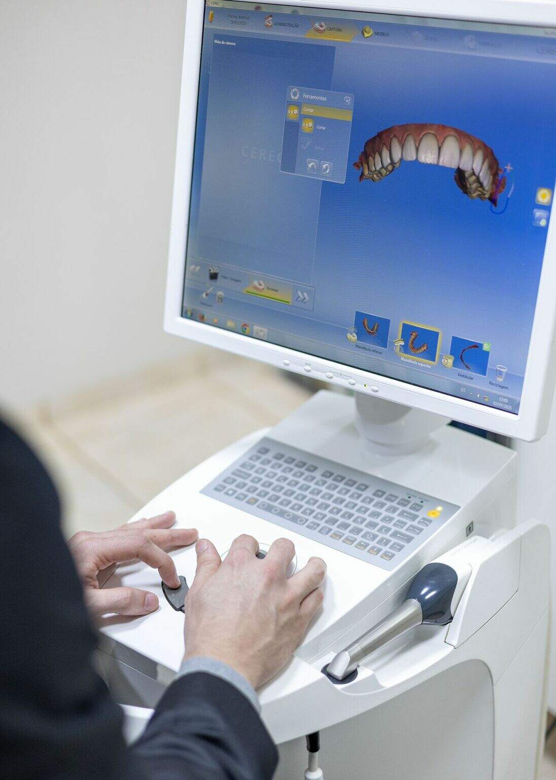 A tecnologia começa com um escaneamento digital da boca, substituindo as antigas moldagens que costumavam causar desconforto. A partir daí, softwares de design do sorriso e recursos de inteligência artificial entram em ação.