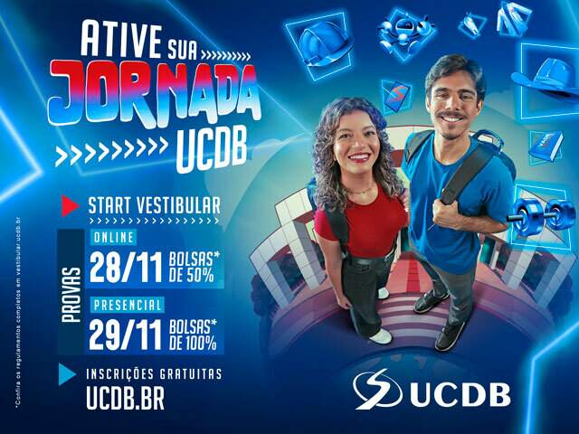Chegou a hora de ativar a sua jornada na melhor universidade de Mato Grosso do Sul! Estão abertas as inscrições para o Vestibular 2026, com mais oportunidades de bolsas de estudo. Serão duas opções de provas: a prova on-line, no dia 28 de novembro, em que os inscritos concorrerão a bolsas de 50% de desconto nas mensalidades; ou a prova presencial, aplicada na UCDB no dia 29 de novembro, às 14h, com bolsas de 100%. As inscrições devem ser feitas pelo site www.vestibular.ucdb.br.