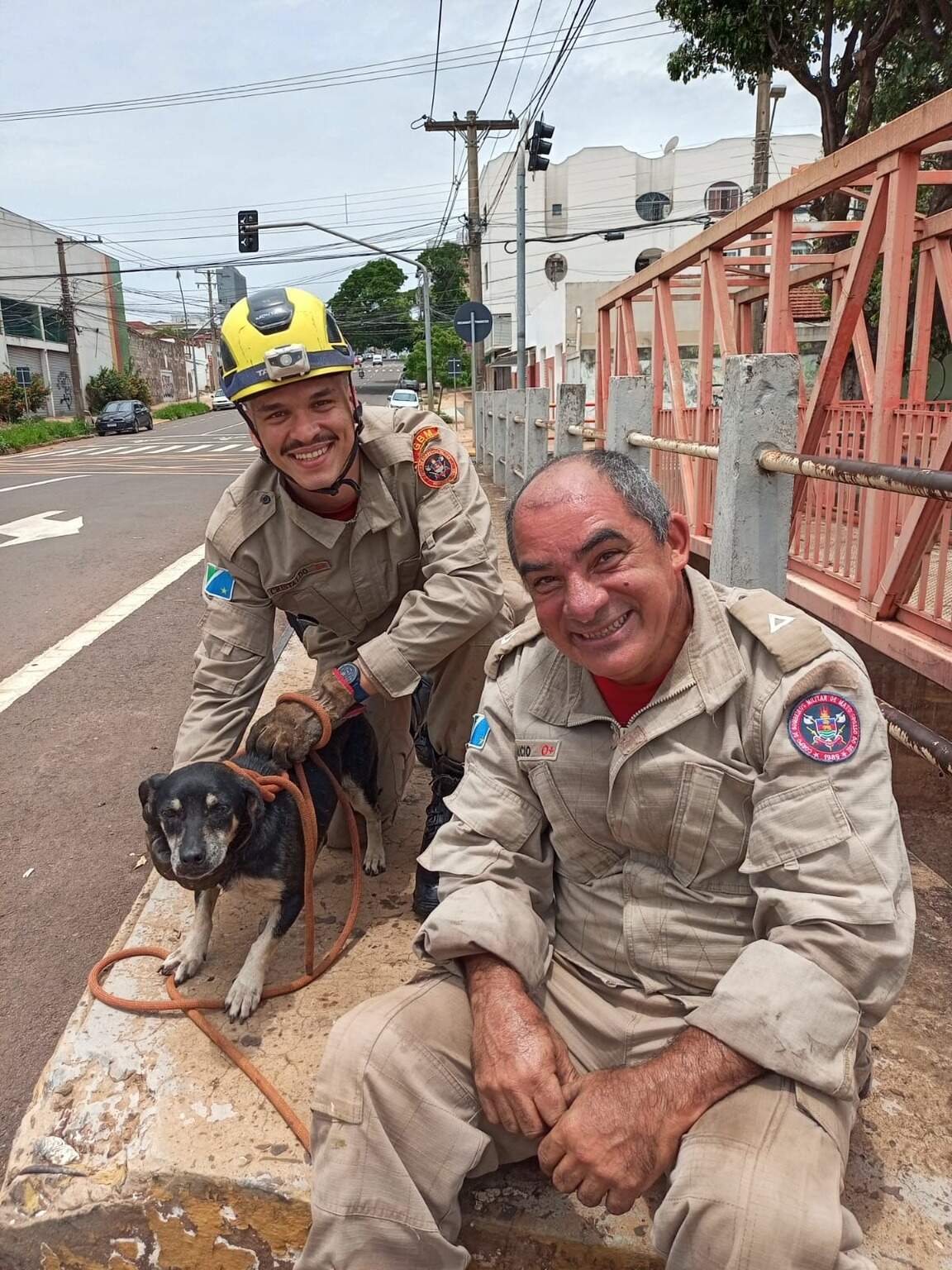 A cadela foi vista primeiramente perto da Avenida Euler de Azevedo e foi acompanhada até um ponto próximo ao local do resgate. "Abaixamos uma escada para chegar perto dela, mas ela saiu andando com medo. A acompanhamos por mais duas quadras e ela parou. O soldado Cristaldo conseguiu se aproximar e conquistou a confiança dela para que subisse", conta o bombeiro Glaucio Santana, que também atendeu o chamado. Os profissionais desceram com a escada, imobilizaram a cadela com uma corda e a içaram.