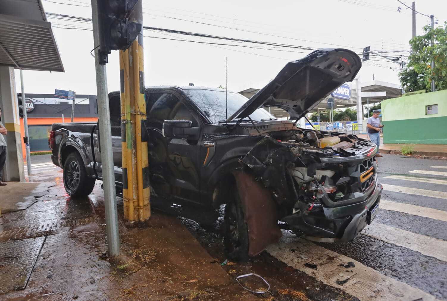 Uma caminhonete Ford F-150 que seguia pela pista do meio da Rua Rui Barbosa, no início da tarde desta segunda-feira (9), causou um acidente ao realizar uma conversão irregular à esquerda. O motorista tentou acessar a Rua Doutor Aníbal de Toledo e acabou atingido por um carro que trafegava pelo corredor de ônibus. Com o impacto, a caminhonete foi lançada para a calçada e chegou a bater em um poste de energia.