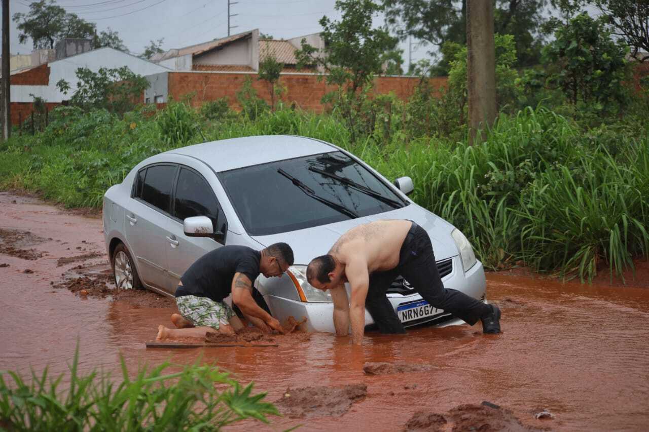 A chuva forte que caiu na tarde desta quinta-feira (13) voltou a causar transtornos no Jardim Noroeste. Um Nissan Sentra prata caiu em uma vala aberta na Rua Aqueluz, depois que o motorista tentou atravessar um trecho tomado pela água. Minutos após o nível baixar, o dono do carro e o primo dele iniciaram a tentativa de resgate, registrada em vídeo.