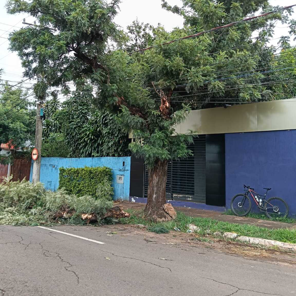 O comerciante contou que tentou contato com os Correios e com o Detran, mas não conseguiu atendimento por ser domingo. Como a árvore ficou danificada e oferecia risco, ele acionou a Defesa Civil para avaliar a situação.