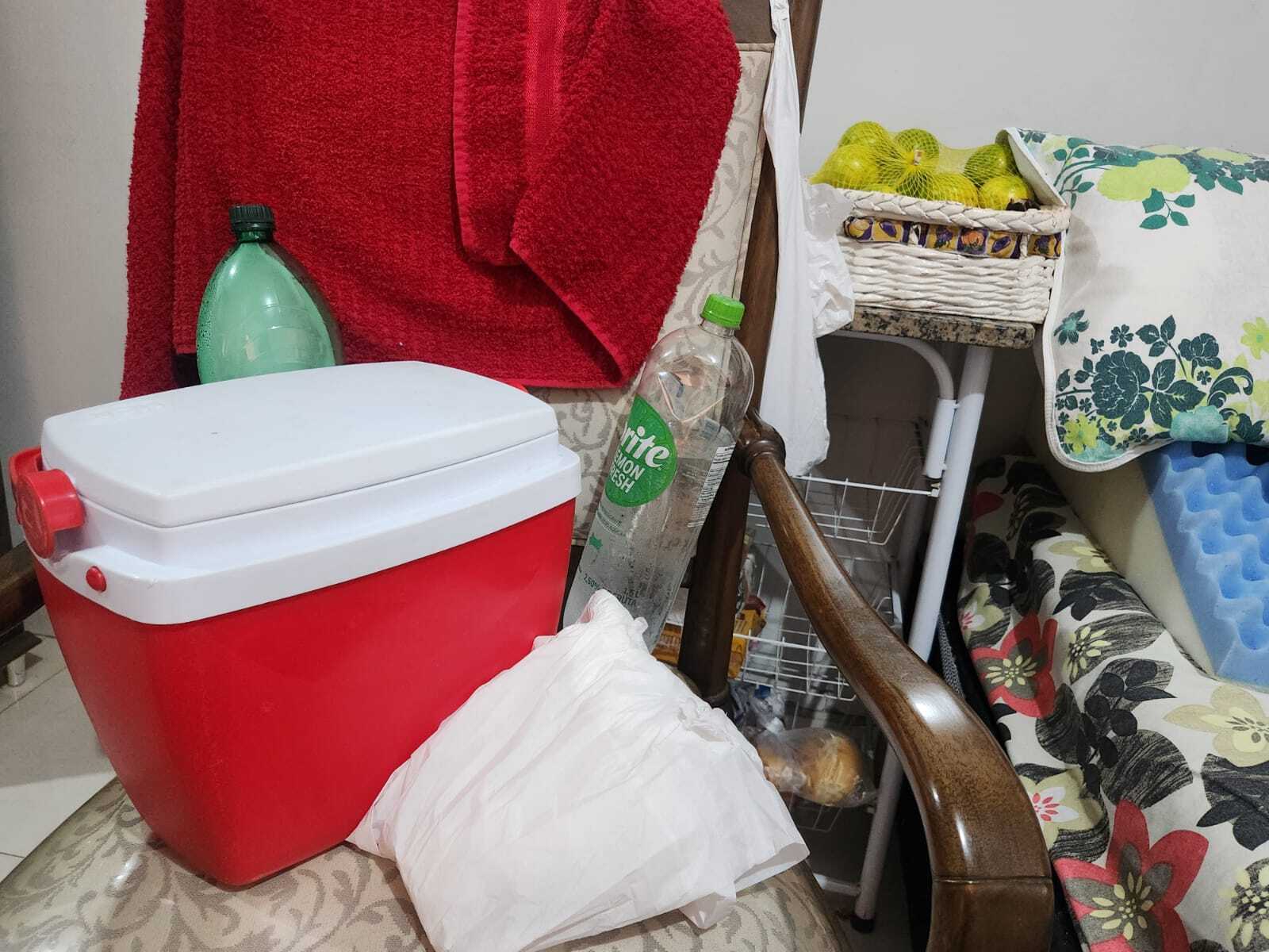 Na sala onde a cama foi improvisada, há um cooler com água, frutas levadas por amigos e um pacote de fraldas já no fim. “Tudo aqui é doação”, afirma.