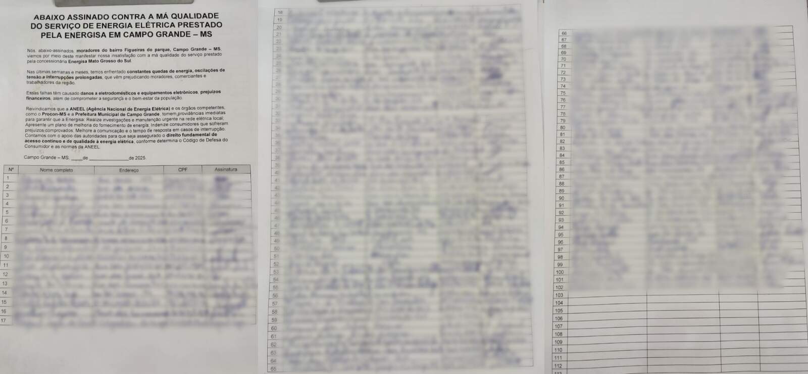 Moradores do Bairro Residencial Figueiras do Parque, em Campo Grande, organizaram um abaixo-assinado contra as frequentes quedas de energia na região. O documento, que já conta com 102 assinaturas, será entregue à Energisa, concessionária responsável pelo fornecimento. O problema persiste há três anos, com interrupções que chegam a durar 18 horas. Moradores relatam prejuízos financeiros, danos a eletrodomésticos e transtornos no dia a dia, especialmente durante mudanças climáticas. Segundo informações preliminares, a região sofre com sobrecarga na rede elétrica.