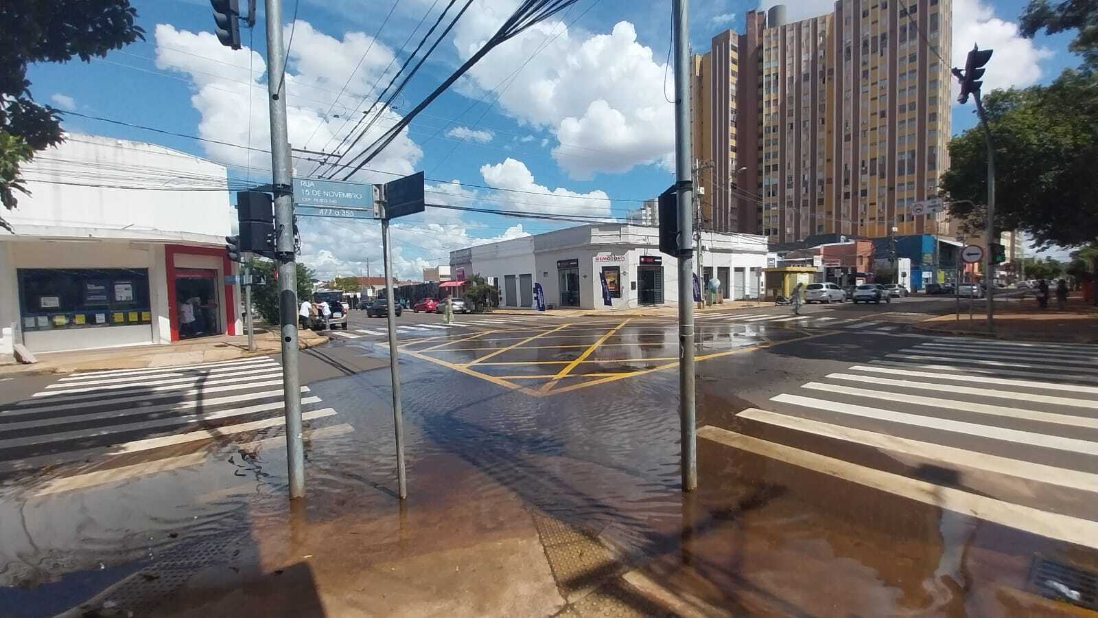 Vazamento no Centro de Campo Grande formou uma lâmina de água no cruzamento das ruas 13 de Maio com a 15 de Novembro. Vídeo encaminhado por meio do canal Direto das Ruas mostra que o problema começa na Afonso Pena com a 13 de Maio.