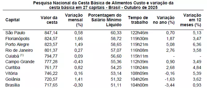 O estudo também mostra o impacto da cesta básica no orçamento do trabalhador. Em outubro, quem recebe um salário mínimo de R$ 1.518,00 precisou trabalhar 112 horas e 39 minutos para comprar a cesta — ligeira melhora em relação a setembro (113h08min) e a outubro de 2024 (117h01min).