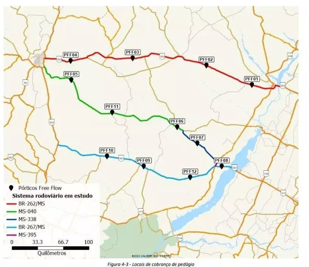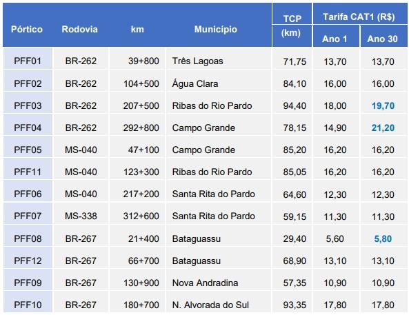 Há ainda cerca de 13 quilômetros de duplicação previstos na BR-267, em Bataguassu. Nos trechos duplicados, o próprio modelo da concessão prevê alteração no valor da tarifa, já que a cobrança considera o padrão da via.