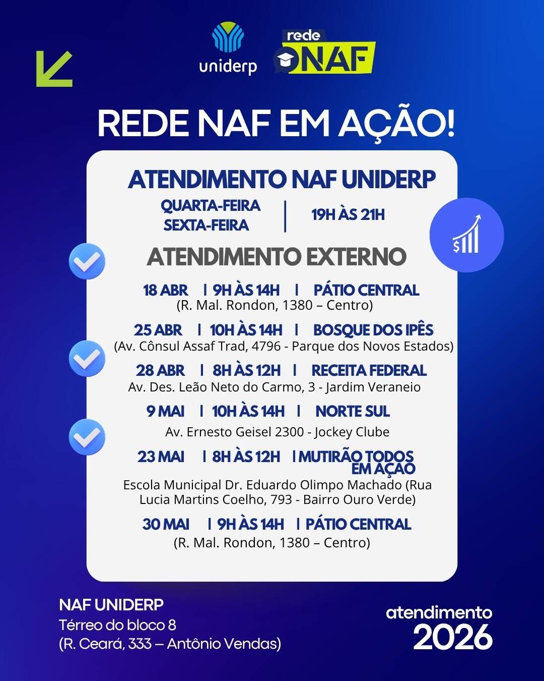 O serviço ocorre por meio do NAF (Núcleo de Apoio Contábil e Fiscal), com orientação supervisionada, dentro da universidade e em ações externas, entre abril e maio.
