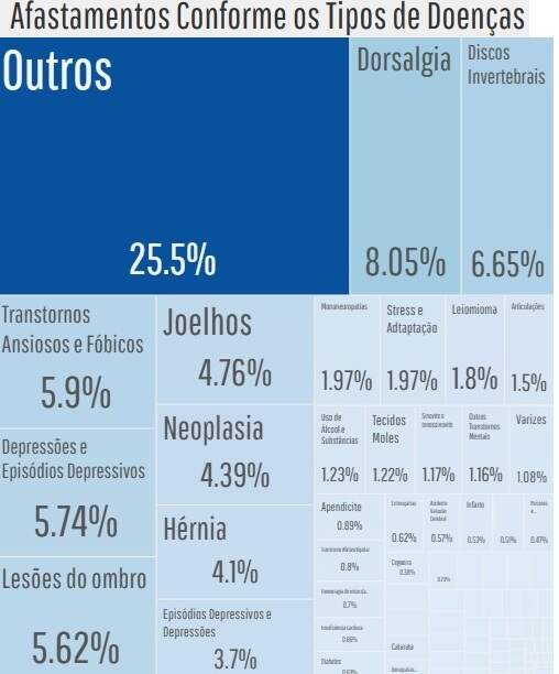 Setores como saúde, educação, frigoríficos e construção civil concentram o maior número de afastamentos. Além dos acidentes típicos, como fraturas e lesões em ombros e joelhos, doenças extralaborais — dores nas costas, cânceres, depressão e outros transtornos mentais — ampliam o total de ocorrências.
