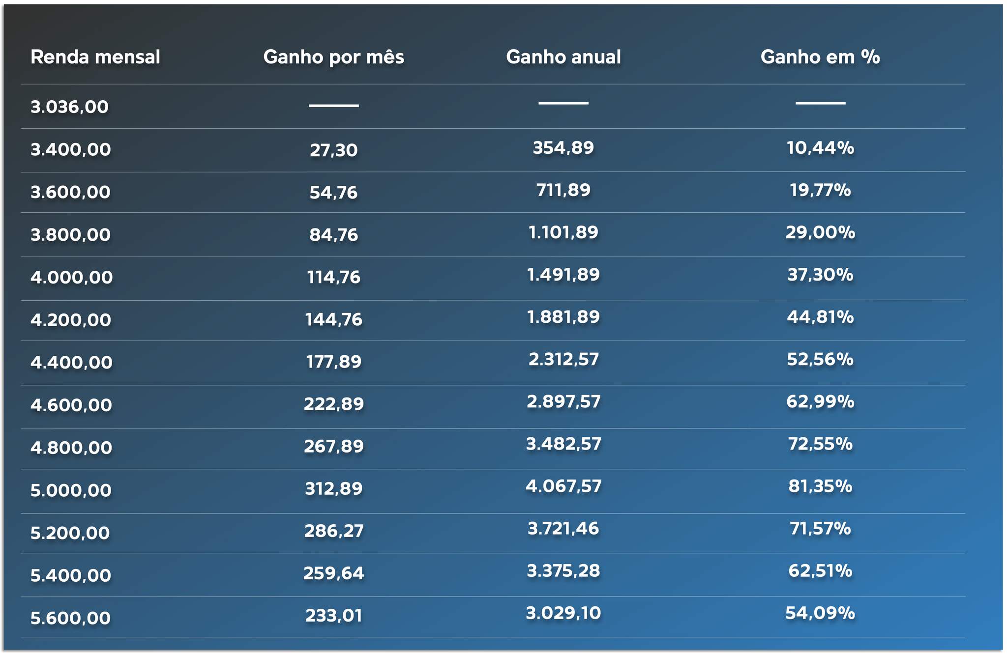 Veja abaixo uma projeção estimada de ganho com a nova legislação