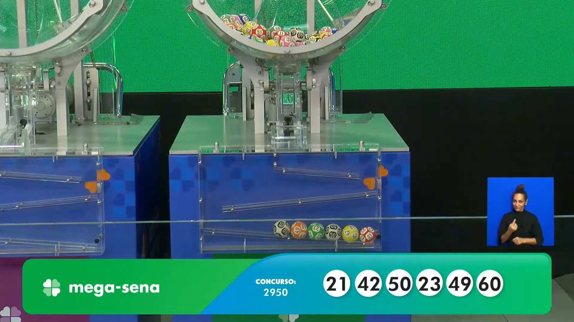Concurso 2.950 da Mega-Sena teve como dezenas: 21, 23, 42, 49, 50, 60. (Foto: Reprodução/Caixa)