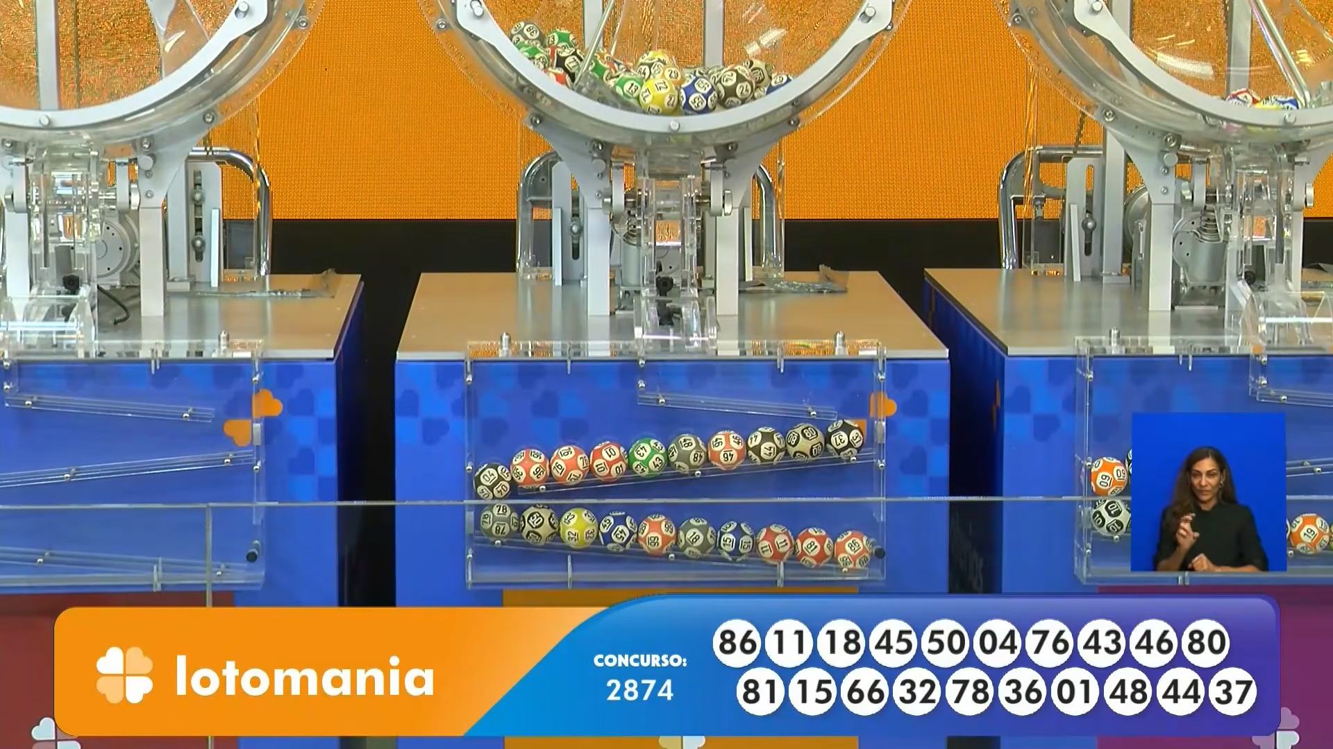 | Lotomania (2.874) | R$ 1.295.013,97 | 1, 4, 11, 15, 18, 32, 36, 37, 43, 44, 45, 46, 48, 50, 66, 76, 78, 80, 81, 86 |