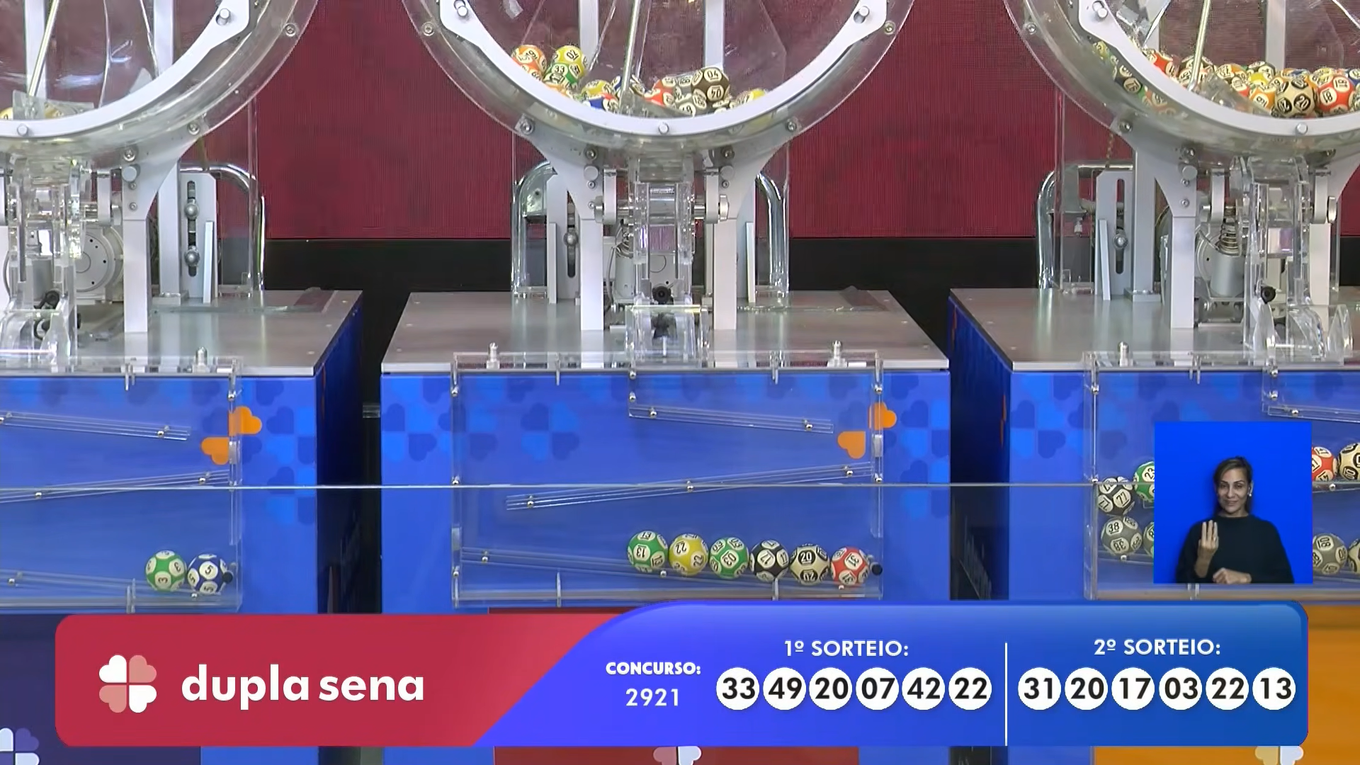 | Dupla Sena (2.921) | R$ 824.725,19 R$ 49.796,12 | 1º sorteio: 7, 20, 22, 33, 42, 49; 2º sorteio: 3, 13, 17, 20, 22, 31 |