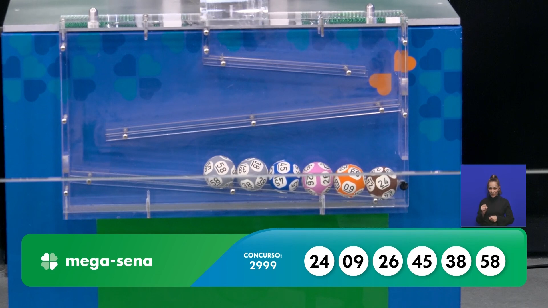 | Mega-Sena | 2.999 | R$ 69.727.825,87 | 9, 24, 26, 38, 45, 58 |